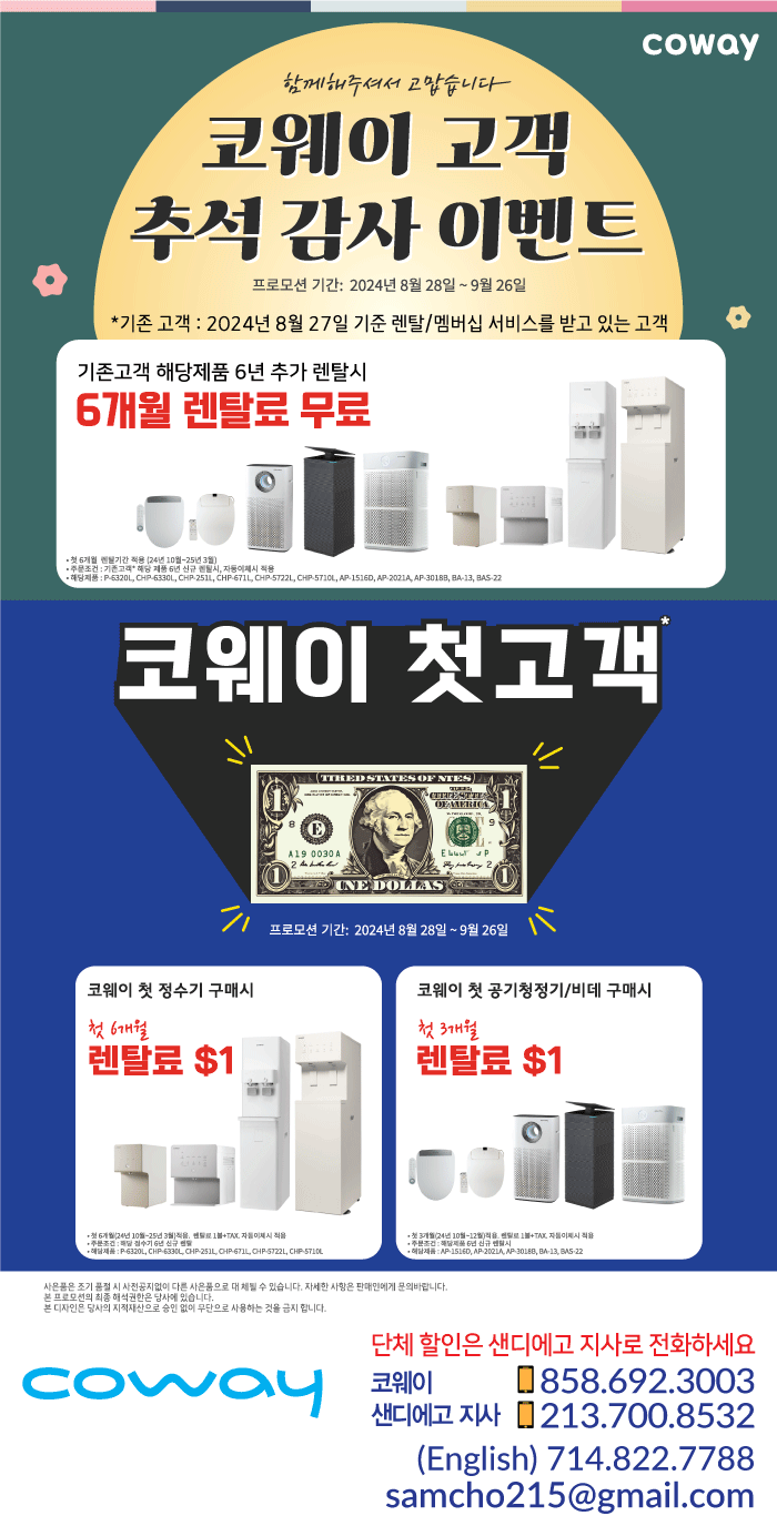 SD 코웨이 9월 6개월간 렌탈료 무료- 기존 고객 추가 6년 렌탈시--해당제품 웅진코웨이SD 세일/쇼핑정보 0 1325 0 0 2024.07.31 20:36 1.석회 중금속을 깨끗하게 걸러주는 그래서 물맛이 깔끔하고 좋은 코웨이 정수기 2.서비스 만족 1위 3. MADE IN KOREA 제품 4. 판매 1위-많은 고객님들이 믿고 쓰는 코웨이 정수 5. 주문 1-2 일 안에 빠른 설치 및 A/S 코웨이 샌디에고 지사가 함께 하겠습니다. 0 0 0 Comments 로그인한 회원만 댓글 등록이 가능합니다. 목록 검색조건 제목 내용 제목+내용 검색어 또는 그리고 검색 번호 제목 이름 날짜 조회 18774 [세일/쇼핑정보] 코웨이 정수기 1000만 렌탈 계정 돌파--미세플라스틱 안정성 … sdcoway 1343 2024.08.29 sdcoway 2024.08.29 1343 18773 [세일/쇼핑정보] SD 10월 프로모션 연장 6개월간 렌탈료 월 $1 대할인 웅진코웨이SD 1385 2024.08.29 웅진코웨이SD 2024.08.29 1385 18772 [비지니스광고] ■■■주택융자■■■ Loan Fee 안받습니다! 착한 이자율 &… DavidYoon 1027 2024.08.29 DavidYoon 2024.08.29 1027 18771 [비지니스광고] 헤어.메이크업.각종행사파티. 루비 957 2024.08.29 루비 2024.08.29 957 18770 [세일/쇼핑정보] 이스트릿투어 - 멕시코 칸쿤 & 로스카보스 호텔 예약 할인점. Angel2023 1438 2024.08.28 Angel2023 2024.08.28 1438 18769 [비지니스광고] The Pine Chiropractic & Acupuncture… Thepinechiroacu 1237 2024.08.26 Thepinechiroacu 2024.08.26 1237 18768 [비지니스광고] 웨딩 전문 사진 특별가격 진행 믿는사진 887 2024.08.26 믿는사진 2024.08.26 887 18767 [비지니스광고] 푸드핸들러카드 취득(Foodhandler Card) foodhandler 983 2024.08.23 foodhandler 2024.08.23 983 18766 [세일/쇼핑정보] 정관장 "추석" 맞이 프로모션!! KGCSD 1397 2024.08.23 KGCSD 2024.08.23 1397 18765 [비지니스광고] 비자/마스터카드 정산 수수료 위반 보상금 신청 대행 Stevehwang 975 2024.08.23 Stevehwang 2024.08.23 975 18764 [비지니스광고] Merchant Services (Terminal, POS, K… Stevehwang 914 2024.08.23 Stevehwang 2024.08.23 914 18763 [비지니스광고] 반영구 스패셜! Kristyle 928 2024.08.22 Kristyle 2024.08.22 928 18762 [비지니스광고] ◆◆부동산 라이센스◆◆ 10일 집중해서 듣고 Pass 했어요! unboring 993 2024.08.21 unboring 2024.08.21 993 18761 [비지니스광고] Merchant Services (Terminal, POS, K… Stevehwang 991 2024.08.21 Stevehwang 2024.08.21 991 18760 [비지니스광고] A Plus 전기, HVAC 에어컨 설치 운영자 1054 2024.05.20 운영자 2024.05.20 1054 18759 [비지니스광고] 프로페셔널한 웹사이트 제작과 효과적인 온라인 마케팅! JESS95 1049 2024.08.20 JESS95 2024.08.20 1049 18758 [비지니스광고] 회사설립, 세금보고 taxaccounting 994 2024.08.19 taxaccounting 2024.08.19 994 18757 [비지니스광고] 융자면허 쪽집게시험대비반(Live Online강의) (맞춤형코스… -oan school 1053 2024.08.19 -oan school 2024.08.19 1053 18756 [비지니스광고] ITIN 신청 접수 대행 세무회계태양2 1225 2024.08.18 세무회계태양2 2024.08.18 1225 18755 [세일/쇼핑정보] 인셀덤 바르시고 예뻐지세요 ~~~ 어린세포의비밀in 1273 2024.08.15 어린세포의비밀in 2024.08.15 1273 18754 [비지니스광고] 법률문제, 이제 걱정 마세요. Diamant 1198 2024.08.14 Diamant 2024.08.14 1198 18753 [비지니스광고] 주택 대출 스페셜 모기지융자 887 2024.08.14 모기지융자 2024.08.14 887 18752 [비지니스광고] Korean BBQ Hood ! 빼도 빼도 안 빠지는 연기 쾌적… -anny 1405 2024.08.13 -anny 2024.08.13 1405 18751 [비지니스광고] 회사설립,상표,특허,트러스트,계약서,비영리법인 -minpro 978 2024.08.12 -minpro 2024.08.12 978 18750 [비지니스광고] 식당 매출 올리기 위한 쉬운 방법 IOICOOKER 1380 2024.08.11 IOICOOKER 2024.08.11 1380 18749 [비지니스광고] 온라인마케팅 구글 마케팅 랭킹 업! 리뷰 업! 소규모 비즈니스 … 케로비 986 2024.08.11 케로비 2024.08.11 986 18748 [비지니스광고] 중국공장 직거래 상품수입 제안드립니다. 세인GL 1127 2024.08.11 세인GL 2024.08.11 1127 18747 [비지니스광고] Ginza sushi Korean menu -eehyun,park 1001 2024.08.10 -eehyun,park 2024.08.10 1001 18746 [비지니스광고] 식품위생 매니저 자격증, Food Safety Manager C… 식품위생교육원 1015 2024.08.10 식품위생교육원 2024.08.10 1015 18745 [비지니스광고] *** 바디프렌드&세라젬 샌디에고*** 바디프렌드SD 864 2024.08.09 바디프렌드SD 2024.08.09 864 18744 [비지니스광고] ■■■주택융자■■■ Loan Fee 안받습니다! 착한 이자율 &… unboring 1074 2024.08.07 unboring 2024.08.07 1074 18743 [타운뉴스] 영화 '파일럿'이 한국에서 개봉후 7일간 극장가에서 압도적 1위 운영자 2326 2024.08.07 운영자 2024.08.07 2326 18742 [비지니스광고] 저렴한 수수료 지금 신청하세요. Stevehwang 862 2024.08.05 Stevehwang 2024.08.05 862 18741 [타운뉴스] 쿨의 이재훈, 김원준 페창가 리조트 카지노서 9월 21일 공동 … 운영자 2628 2024.08.05 운영자 2024.08.05 2628 18740 [비지니스광고] ⭐김나나 샌디에고 부동산⭐기다리던 단층집! 랜초버나드 2Bed… NaNaStar 1244 2024.08.02 NaNaStar 2024.08.02 1244 18739 [비지니스광고] [온라인] MIDI 음악 작곡/편곡 프로듀싱 레슨 Lylaluna 1034 2024.08.01 Lylaluna 2024.08.01 1034 18738 [세일/쇼핑정보] 요즘 핫한 인셀덤 화장품 어린세포의비밀in 1418 2024.08.01 어린세포의비밀in 2024.08.01 1418 18737 [비지니스광고] 샌디에고 타투아티스트 Justingjordan 1255 2024.07.31 Justingjordan 2024.07.31 1255 열람중 [세일/쇼핑정보] SD 코웨이 9월 6개월간 렌탈료 무료- 기존 고객 추가 6년… 웅진코웨이SD 1326 2024.07.31 
