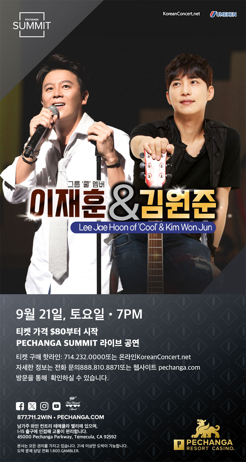 90년대 대표 훈남 가수들이 남가주에 온다. Pechanga 리조트 카지노가 쿨의 이재훈과 김원준의 라이브 콘서트를 오는 9월 21일 (토, 저녁 7시) Pechanga Summit에서 단독 개최한다.