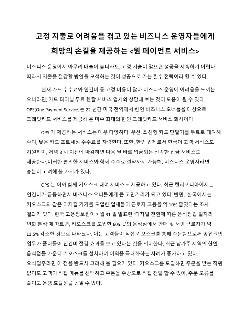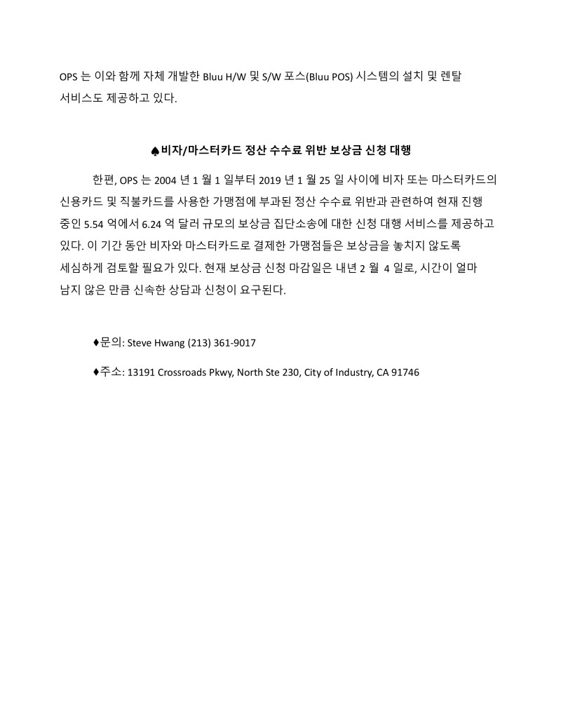 비자/마스터카드 정산 수수료 위반 보상금 신청 대행 Stevehwang 비지니스광고 0 975 0 0 2024.08.23 10:53 비자/마스터카드 정산 수수료 위반 보상금 신청 대행 0 0 0 Comments 로그인한 회원만 댓글 등록이 가능합니다. 목록 검색조건 제목 내용 제목+내용 검색어 또는 그리고 검색 번호 제목 이름 날짜 조회 19134 [비지니스광고] 세무사면허 시험대비반 (Live Online강의)(맞춤… EAschool 733 2025.09.05 EAschool 2025.09.05 733 19133 [비지니스광고] 한인 가전업체 ‘Cuckoo’ 美 소비자 집단소송 피소… VIRUSX 793 2025.09.05 VIRUSX 2025.09.05 793 19132 [세일/쇼핑정보] 코웨이 정수기 석회.중금속이 없어 물맛이 정말 좋아요-… sdcoway 1090 2025.09.05 sdcoway 2025.09.05 1090 19131 [비지니스광고] 미국비자문제, 이민페티션문제, 거절된비자, 체류신분, … usvisa 669 2025.09.05 usvisa 2025.09.05 669 19130 [비지니스광고] 아름다운 당신을 초대합니다. 어린세포 646 2025.09.03 어린세포 2025.09.03 646 19129 [비지니스광고] 미국에서 타던 벤츠 BMW 토요타 혼다 자동차도 한국 … 현대해운 825 2025.09.01 현대해운 2025.09.01 825 19128 [비지니스광고] <인스타그램 S.M.S(비지니스 소.셜 미.디어마케팅 … Instaorange714 636 2025.08.30 Instaorange714 2025.08.30 636 19127 [타운뉴스] YB (윤도현 밴드), 10월 11일 페창가 리조트 카… 운영자 1374 2025.08.28 운영자 2025.08.28 1374 19126 [세일/쇼핑정보] SD코웨이 11월 프로모션 빅세일-- 웅진코웨이SD 1032 2025.08.28 웅진코웨이SD 2025.08.28 1032 19125 3 [비지니스광고] 한국발->미국 샌디에고행 국제 소화물(택배) 운송, 관… 3 WizmonExpress 1136 2025.08.27 WizmonExpress 2025.08.27 1136 19124 [비지니스광고] 메뉴 디자인, 명함, 플라이어, 배너, 홍보물, 싸인,… -anny 556 2025.08.27 -anny 2025.08.27 556 19123 [비지니스광고] Korean BBQ Hood! 바베큐 고기집 후드 빼도… -anny 656 2025.08.27 -anny 2025.08.27 656 19122 [비지니스광고] ◆주택융자◆ Loan Fee 안받습니다! 착한 이자율 … DavidYoon 670 2025.08.26 DavidYoon 2025.08.26 670 19121 [비지니스광고] 미국비자문제, 이민페티션문제, 거절된비자, 체류신분, … usvisa 465 2025.08.26 usvisa 2025.08.26 465 19120 [비지니스광고] 한국 정식 아이나비 블랙박스 denny 746 2025.08.26 denny 2025.08.26 746 19119 [비지니스광고] 아동신분 보호법 (CSPA) 자녀 승인가능날짜로 이민 … 스마트이주공사 539 2025.08.25 스마트이주공사 2025.08.25 539 19118 [비지니스광고] KJ 카펫, 마루, 키친 케비넷 리모델링 전문 운영자 699 2025.06.26 운영자 2025.06.26 699 19117 [비지니스광고] <인스타그램 S.M.S(비지니스 소.셜미.디어 마케팅 … Instaorange714 712 2025.08.24 Instaorange714 2025.08.24 712 19116 [세일/쇼핑정보] 마스터 S4 신규런칭 및 LABOR DAY 프로모션 시… 세라젬마스터 1067 2025.08.23 세라젬마스터 2025.08.23 1067 19115 [비지니스광고] 영어 통역/번역 합니다 Sdmike 717 2025.08.21 Sdmike 2025.08.21 717 초기화 날짜순 조회순 정렬 검색 678910 Search 검색대상 제목 내용 제목+내용 회원아이디 회원아이디(코) 글쓴이 글쓴이(코) 또는 그리고 검색어 필수 검색 닫기