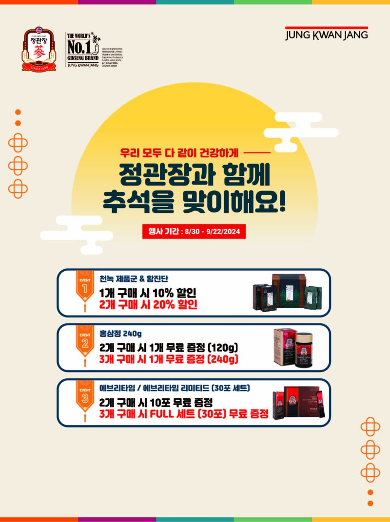 정관장 "추석" 맞이 프로모션!! KGCSD 세일/쇼핑정보 0 1395 0 0 2024.08.23 11:46 안녕하세요!샌디에고 정관장 입니다.다가오는 추석을 맞이하여 8/30 ~ 9/22 기간동안 행사를 진행합니다.한가위 보름달처럼 환하고 풍요로운 명절 보내시길 바라며, 정성스레 준비한 정관장의 선물이 고객님의 가정에 건강과 평안을 더해드리길 소망합니다. 매장 시온 마켓내 위치전화 문의 858-571-0975문자 문의 858-877-1175 0 0 0 Comments 로그인한 회원만 댓글 등록이 가능합니다. 목록 검색조건 제목 내용 제목+내용 검색어 또는 그리고 검색 번호 제목 이름 날짜 조회 18774 [세일/쇼핑정보] 코웨이 정수기 1000만 렌탈 계정 돌파--미세플라스틱 안정성 … sdcoway 1340 2024.08.29 sdcoway 2024.08.29 1340 18773 [세일/쇼핑정보] SD 10월 프로모션 연장 6개월간 렌탈료 월 $1 대할인 웅진코웨이SD 1383 2024.08.29 웅진코웨이SD 2024.08.29 1383 18772 [비지니스광고] ■■■주택융자■■■ Loan Fee 안받습니다! 착한 이자율 &… DavidYoon 1027 2024.08.29 DavidYoon 2024.08.29 1027 18771 [비지니스광고] 헤어.메이크업.각종행사파티. 루비 957 2024.08.29 루비 2024.08.29 957 18770 [세일/쇼핑정보] 이스트릿투어 - 멕시코 칸쿤 & 로스카보스 호텔 예약 할인점. Angel2023 1438 2024.08.28 Angel2023 2024.08.28 1438 18769 [비지니스광고] The Pine Chiropractic & Acupuncture… Thepinechiroacu 1237 2024.08.26 Thepinechiroacu 2024.08.26 1237 18768 [비지니스광고] 웨딩 전문 사진 특별가격 진행 믿는사진 886 2024.08.26 믿는사진 2024.08.26 886 18767 [비지니스광고] 푸드핸들러카드 취득(Foodhandler Card) foodhandler 983 2024.08.23 foodhandler 2024.08.23 983 열람중 [세일/쇼핑정보] 정관장 "추석" 맞이 프로모션!! KGCSD 1396 2024.08.23 KGCSD 2024.08.23 1396 18765 [비지니스광고] 비자/마스터카드 정산 수수료 위반 보상금 신청 대행 Stevehwang 975 2024.08.23 Stevehwang 2024.08.23 975 18764 [비지니스광고] Merchant Services (Terminal, POS, K… Stevehwang 913 2024.08.23 Stevehwang 2024.08.23 913 18763 [비지니스광고] 반영구 스패셜! Kristyle 928 2024.08.22 Kristyle 2024.08.22 928 18762 [비지니스광고] ◆◆부동산 라이센스◆◆ 10일 집중해서 듣고 Pass 했어요! unboring 993 2024.08.21 unboring 2024.08.21 993 18761 [비지니스광고] Merchant Services (Terminal, POS, K… Stevehwang 989 2024.08.21 Stevehwang 2024.08.21 989 18760 [비지니스광고] A Plus 전기, HVAC 에어컨 설치 운영자 1049 2024.05.20 운영자 2024.05.20 1049 18759 [비지니스광고] 프로페셔널한 웹사이트 제작과 효과적인 온라인 마케팅! JESS95 1045 2024.08.20 JESS95 2024.08.20 1045 18758 [비지니스광고] 회사설립, 세금보고 taxaccounting 992 2024.08.19 taxaccounting 2024.08.19 992 18757 [비지니스광고] 융자면허 쪽집게시험대비반(Live Online강의) (맞춤형코스… -oan school 1048 2024.08.19 -oan school 2024.08.19 1048 18756 [비지니스광고] ITIN 신청 접수 대행 세무회계태양2 1224 2024.08.18 세무회계태양2 2024.08.18 1224 18755 [세일/쇼핑정보] 인셀덤 바르시고 예뻐지세요 ~~~ 어린세포의비밀in 1273 2024.08.15 어린세포의비밀in 2024.08.15 1273 18754 [비지니스광고] 법률문제, 이제 걱정 마세요. Diamant 1194 2024.08.14 Diamant 2024.08.14 1194 18753 [비지니스광고] 주택 대출 스페셜 모기지융자 886 2024.08.14 모기지융자 2024.08.14 886 18752 [비지니스광고] Korean BBQ Hood ! 빼도 빼도 안 빠지는 연기 쾌적… -anny 1403 2024.08.13 -anny 2024.08.13 1403 18751 [비지니스광고] 회사설립,상표,특허,트러스트,계약서,비영리법인 -minpro 976 2024.08.12 -minpro 2024.08.12 976 18750 [비지니스광고] 식당 매출 올리기 위한 쉬운 방법 IOICOOKER 1380 2024.08.11 IOICOOKER 2024.08.11 1380 18749 [비지니스광고] 온라인마케팅 구글 마케팅 랭킹 업! 리뷰 업! 소규모 비즈니스 … 케로비 982 2024.08.11 케로비 2024.08.11 982 18748 [비지니스광고] 중국공장 직거래 상품수입 제안드립니다. 세인GL 1123 2024.08.11 세인GL 2024.08.11 1123 18747 [비지니스광고] Ginza sushi Korean menu -eehyun,park 1000 2024.08.10 -eehyun,park 2024.08.10 1000 18746 [비지니스광고] 식품위생 매니저 자격증, Food Safety Manager C… 식품위생교육원 1011 2024.08.10 식품위생교육원 2024.08.10 1011 18745 [비지니스광고] *** 바디프렌드&세라젬 샌디에고*** 바디프렌드SD 864 2024.08.09 바디프렌드SD 2024.08.09 864 18744 [비지니스광고] ■■■주택융자■■■ Loan Fee 안받습니다! 착한 이자율 &… unboring 1073 2024.08.07 unboring 2024.08.07 1073 18743 [타운뉴스] 영화 '파일럿'이 한국에서 개봉후 7일간 극장가에서 압도적 1위 운영자 2323 2024.08.07 운영자 2024.08.07 2323 18742 [비지니스광고] 저렴한 수수료 지금 신청하세요. Stevehwang 861 2024.08.05 Stevehwang 2024.08.05 861 18741 [타운뉴스] 쿨의 이재훈, 김원준 페창가 리조트 카지노서 9월 21일 공동 … 운영자 2627 2024.08.05 운영자 2024.08.05 2627 18740 [비지니스광고] ⭐김나나 샌디에고 부동산⭐기다리던 단층집! 랜초버나드 2Bed… NaNaStar 1242 2024.08.02 NaNaStar 2024.08.02 1242 18739 [비지니스광고] [온라인] MIDI 음악 작곡/편곡 프로듀싱 레슨 Lylaluna 1030 2024.08.01 Lylaluna 2024.08.01 1030 18738 [세일/쇼핑정보] 요즘 핫한 인셀덤 화장품 어린세포의비밀in 1418 2024.08.01 어린세포의비밀in 2024.08.01 1418 18737 [비지니스광고] 샌디에고 타투아티스트 Justingjordan 1255 2024.07.31 Justingjordan 2024.07.31 1255 18736 [세일/쇼핑정보] SD 코웨이 9월 6개월간 렌탈료 무료- 기존 고객 추가 6년… 웅진코