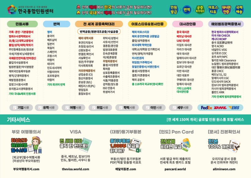 한국통합민원센터에서는 국내외 민원서류에 대한 '발급-번역-공증촉탁대리-외교부(아포스티유, 영사확인)-대사관 인증-해외 배송'이라는 복잡하고 까다로운 과정을 온라인, 모바일로 손쉽게 신청하고 처리할 수 있도록 서비스를 제공하고 있습니다.