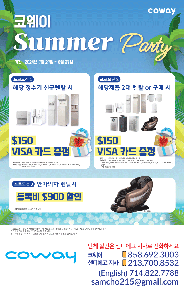 SD 코웨이 8월 1대 $150 / 2대 $300 비자카드증정
