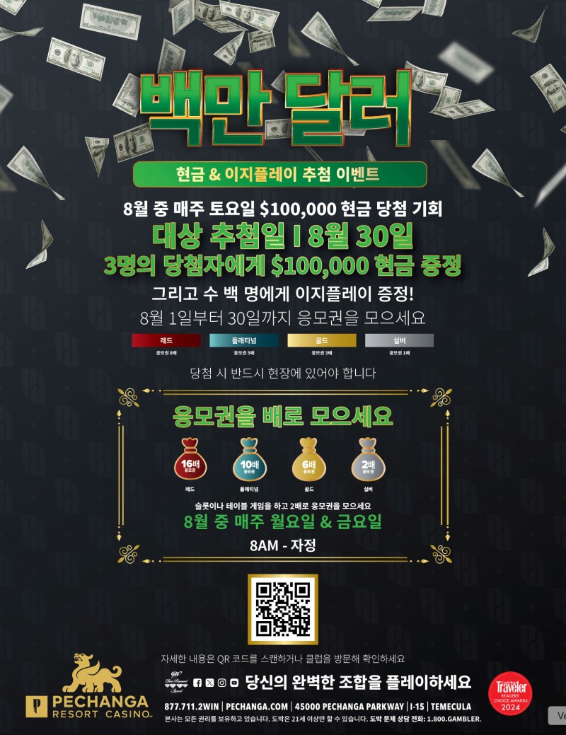 테메큘라, 캘리포니아 -- (2025 7 XX) – 오는 8, 페창가 리조트 카지노가 총 100만 달러 상당의 현금 및 경품을 증정하는 이벤트로 남가주의 여름을 더욱 뜨겁게 달굴 예정이다. 8월의 뜨거운 낮과 밤 동안 대박 상금과 경품들에 시원하게 당첨되길 원한다면 딱 세 가지만 기억하면 된다. 첫째, 페창가 클럽 회원이어야 한다. 둘째, 응모권을 모으려면 좋아하는 슬롯이나 테이블 게임을 할 때 클럽 카드를 사용한다. 셋째, 8월 중 매주 토요일 오후 4시부터 밤 9시 반 사이 페창가 리조트 카지노를 방문해 응모권을 활성화시키고 현장에 머물며 추첨 결과를 확인하면 된다.