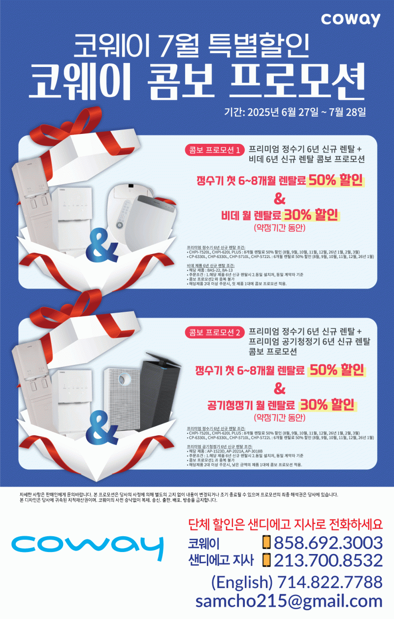 SD 코웨이 7월 프로모션 최대할인 6개월. 8개월 추가 30% 할인