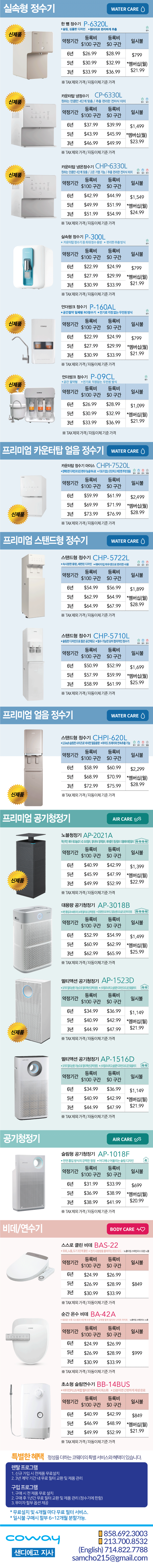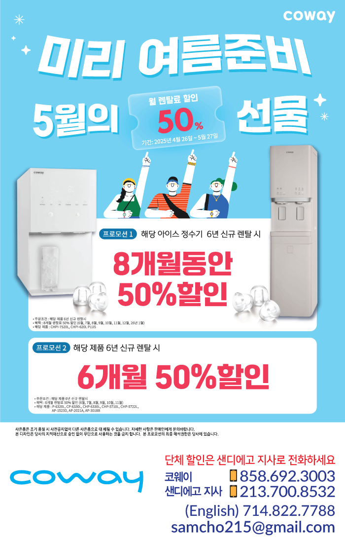 SD 코웨이 5월 프로모션 최대 8개월 렌탈료 50% 할인 웅진코웨이SD 세일/쇼핑정보 0 1057 0 0 2025.05.01 07:42 SD 코웨이 5월 프로모션 최대 8개월 렌탈료 50% 할인-얼음정수기 1.석회 중금속을 깨끗하게 걸러주는 그래서 물맛이 깔끔하고 좋은 코웨이 정수기 2.서비스 만족 1위 3. MADE IN KOREA 제품 4. 판매 1위-많은 고객님들이 믿고 쓰는 코웨이 정수 5. 주문 1-2 일 안에 빠른 설치 및 A/S 코웨이 샌디에고 지사가 함께 하겠습니다. 0 0 0 Comments 로그인한 회원만 댓글 등록이 가능합니다. 목록 검색조건 제목 내용 제목+내용 검색어 또는 그리고 검색 번호 제목 이름 날짜 조회 19014 [타운뉴스] 2025 VBS (샌디에고 갈보리 장로교회) 권혜빈 1347 2025.05.08 권혜빈 2025.05.08 1347 19013 [타운뉴스] 대한민국 제21대 대통령은 내손으로 직접 뽑는다. 5월22일부터… SD라코 1233 2025.05.08 SD라코 2025.05.08 1233 19012 [비지니스광고] 성공적인 비즈니스를 위한 최고의 결제 및 POS 솔루션! FirstMerchantSe… 711 2025.05.08 FirstMerchantSe… 2025.05.08 711 19011 [타운뉴스] 무료 영화 관람 초대합니다. - The King of Kings HIJCC10635 1259 2025.05.07 HIJCC10635 2025.05.07 1259 19010 [비지니스광고] ★★★★★ 샌디에고 최저가 보장 / 로컬이사 / 365 MOVI… PUMYANGSD 867 2025.05.05 PUMYANGSD 2025.05.05 867 19009 [비지니스광고] Customize T_Shirts & Mug -OAH 630 2025.05.03 -OAH 2025.05.03 630 19008 [세일/쇼핑정보] 코웨이 정수기-석회 중금속을 깨끗하게 걸러주어서 물맛이 깔금합니… sdcoway 1436 2025.05.01 sdcoway 2025.05.01 1436 19007 [비지니스광고] "피아노 & 작곡 레슨 – 15년 경력의 전문가와 함께!" navypier 651 2025.05.01 navypier 2025.05.01 651 열람중 [세일/쇼핑정보] SD 코웨이 5월 프로모션 최대 8개월 렌탈료 50% 할인 웅진코웨이SD 1058 2025.05.01 웅진코웨이SD 2025.05.01 1058 19005 [비지니스광고] 로컬이사 / 365 MOVING / 범양 / 샌디에고 로컬이사… PUMYANGSD 633 2025.04.30 PUMYANGSD 2025.04.30 633 19004 [비지니스광고] ** 정부 무료 전화 서비스 혜택 ** (정부 무료 혜택) haeyon 709 2025.04.30 haeyon 2025.04.30 709 19003 [비지니스광고] BODYFRIEND 딜러사 모집' chrispark3483 688 2025.04.29 chrispark3483 2025.04.29 688 19002 [비지니스광고] 아름다움을 선물합니다. 어린세포 596 2025.04.28 어린세포 2025.04.28 596 19001 [비지니스광고] 보험면허시험반(한국어시험신설) (적중 한국어교재로 최단기 합격 … -nsurance 773 2025.04.26 -nsurance 2025.04.26 773 19000 [비지니스광고] Thorne 쏜 영양제 Moduwa 637 2025.04.25 Moduwa 2025.04.25 637 18999 [타운뉴스] 2025 한국유학 박람회 (5/31 Sat. ~ 6/1 Sun.… 한국교육원 1215 2025.04.25 한국교육원 2025.04.25 1215 18998 [비지니스광고] Newhome Design Studio-Kitchen&bath … NewhomeDesign 755 2025.04.25 NewhomeDesign 2025.04.25 755 18997 [타운뉴스] 이문세의 미주 콘서트 LA & NY/NJ 이문세미주콘서트 4786 2025.04.25 이문세미주콘서트 2025.04.25 4786 18996 [세일/쇼핑정보] 세라젬 플러튼 신제품 런칭 및 얼리 마덜스데이 스페셜 시작합니다 세라젬마스터 1187 2025.04.21 세라젬마스터 2025.04.21 1187 18995 [타운뉴스] 백지영 25주년 기념 콘서트, 페창가 리조트 카지노서 5월 31… 운영자 1244 2025.04.21 운영자 2025.04.21 1244 18994 [비지니스광고] ■ 부동산 라이센스 ■한글 교재로 강의 듣고, 한 번에 합격! unboring 759 2025.04.21 unboring 2025.04.21 759 18993 [세일/쇼핑정보] [한풍경옥고] 모든 제품 두개구입시 홍삼증정(5월 30일까지) hpusa 1015 2025.04.20 hpusa 2025.04.20 1015 18992 [비지니스광고] 블라인드를 엘에이 가격에 구입하세요 JCSN 630 2025.04.20 JCSN 2025.04.20 630 18991 [비지니스광고] First Home Buyers 들이 가장 많이 하는 실수 5 … 이미화리얼터 602 2025.04.20 이미화리얼터 2025.04.20 602 18990 [비지니스광고] 취업이민 청원서 I-140 접수시 ETA-9089 제출할 필요없… 스마트이주공사 630 2025.04.18 스마트이주공사 2025.04.18 630 18989 [세일/쇼핑정보] 울타리 몰(샌디에고 지점) 할인 행사 안내! sysy 1431 2025.04.15 sysy 2025.04.15 1431 18988 [타운뉴스] 샌디에고 진도 5.2규모 지진 발생 - 진원지는 샌디에고 남동쪽… SD라코 1396 2025.04.14 SD라코 2025.04.14 1396 18987 [비지니스광고] 봄햇살 가득함을 선물합니다 어린세포 695 2025.04.13 어린세포 2025.04.13 695 18986 [비지니스광고] 라스베가스 한인택시/바로 바로 732 2025.04.10 바로 2025.04.10 732 18985 [타운뉴스] 페창가, 제 2025 Pechanga Pro-Am 대회 4월 8… 운영자 1356 2025.04.09 운영자 2025.04.09 1356 18984 [비지니스광고] ETL 인증 받은 식당용 1인용 압력솥밥 인덕션(캐나다 현지에서… IOICOOKER 800 2025.04.08 IOICOOKER 2025.04.08 800 18983 1 [비지니스광고] 에어콘 수리, 설치, 그리고 히팅 문의 1 johnHVACR 806 2025.04.07 johnHVACR 2025.04.07 806 18982 [비지니스광고] 출국금지 입국금지 출입국금지조회 출입국금지처분 출입국금지취소 여… Guide2EFK 795 2025.04.06 Guide2EFK 2025.04.06 795 18981 [비지니스광고] 회사설립, 세금보고 taxaccounting 691 2025.04.05 taxaccounting 2025.04.05 691 18980 [비지니스광고] 푸드핸들러카드 취득(Foodhandler Card) foodhandler 647 2025.04.05 foodhandler 2025.04.05 647 18979 [비지니스광고] 피부미인을 위한 첫걸음 ... 어린세포 698 2025.04.03 어린세포 2025.04.03 698 18978 [비지니스광고] Korea #1 테이블 오더 시스템 점주님들께 혁명을!! YUNA777 639 2025.04.02 YUNA777 2025.04.02 639 18977 [비지니스광고] 리모델링 무료 견적 (봄 스페샬) Kare 777 2025.04.