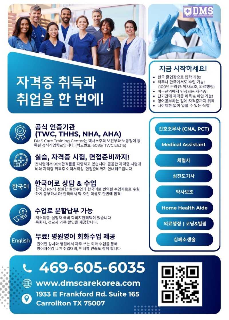 DMS Care Training Center는 간호조무사(PCT), 메디컬 어시스턴트(MA),