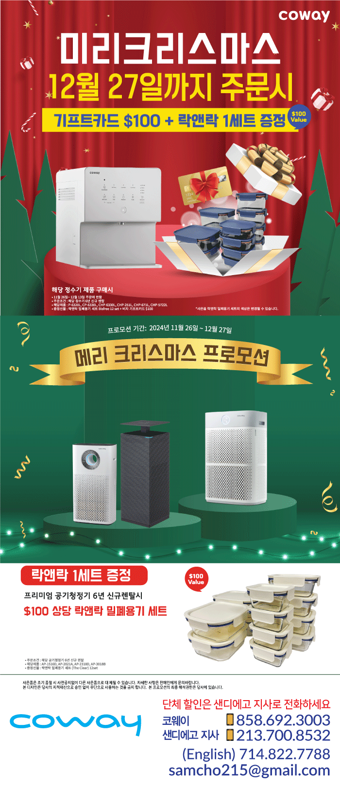 SD코웨이 메리크리스마스 락엔락 셋트.기프트 카드 증정--해당 제품 웅진코웨이SD 세일/쇼핑정보 0 1268 0 0 2024.10.31 20:25 1.석회 중금속을 깨끗하게 걸러주는 그래서 물맛이 깔끔하고 좋은 코웨이 정수기 2.서비스 만족 1위 3. MADE IN KOREA 제품 4. 판매 1위-많은 고객님들이 믿고 쓰는 코웨이 정수 5. 주문 1-2 일 안에 빠른 설치 및 A/S 코웨이 샌디에고 지사가 함께 하겠습니다. 0 0 0 Comments 로그인한 회원만 댓글 등록이 가능합니다. 목록 검색조건 제목 내용 제목+내용 검색어 또는 그리고 검색 번호 제목 이름 날짜 조회 18894 [비지니스광고] 감시카메라 CCTV 선택이 아닌 필수시대 25cctv 867 2024.12.31 25cctv 2024.12.31 867 18893 [세일/쇼핑정보] SD코웨이 공기 청정기 할인 행사 -$200 기프트 카드 증정-… 웅진코웨이SD 1344 2024.12.30 웅진코웨이SD 2024.12.30 1344 18892 [비지니스광고] 콘보이 H마트 근처 방 렌트 합니다 sophiakk 842 2024.12.23 sophiakk 2024.12.23 842 18891 [비지니스광고] 결혼 사진 촬영합니다. 돌, 파티, 행사 사진도 합니다. 믿는사진 772 2024.12.20 믿는사진 2024.12.20 772 18890 [비지니스광고] 부동산면허시험(실시간Online강의)(브로커/에이전트)(맞춤형코… realestatepasse… 872 2024.12.18 realestatepasse… 2024.12.18 872 18889 [타운뉴스] 세무사면허 시험대비반 (Live Online강의)(맞춤형코스)(… EAschool 1246 2024.12.18 EAschool 2024.12.18 1246 18888 [비지니스광고] SD 코웨이 12월 프로모션--메리크리스마스 기프트 및 상품 … 웅진코웨이SD 857 2024.11.26 웅진코웨이SD 2024.11.26 857 18887 [비지니스광고] 반영구 연말 스패셜! Kristyle 795 2024.12.16 Kristyle 2024.12.16 795 18886 [비지니스광고] 보험면허시험반(한국어시험신설) (적중 한국어교재로 최단기 합격 … -nsurance 1045 2024.12.15 -nsurance 2024.12.15 1045 18885 [타운뉴스] 국카스텐 [Guckkasten] 페창가 콘서트 운영자 1193 2024.12.13 운영자 2024.12.13 1193 18884 [비지니스광고] ■온라인 부동산 라이센스 강의!■ 한국어 교재로 한번에 합격 unboring 936 2024.12.12 unboring 2024.12.12 936 18883 [비지니스광고] 특별한 회원을 모집합니다. 어린세포 883 2024.12.10 어린세포 2024.12.10 883 18882 [세일/쇼핑정보] 정관장 연말 크리스마스 세일!! KGCSD 1387 2024.12.09 KGCSD 2024.12.09 1387 18881 [비지니스광고] 푸드핸들러카드 취득(Foodhandler Card) foodhandler 802 2024.12.08 foodhandler 2024.12.08 802 18880 [비지니스광고] ◆◆주택융자◆◆착한 이자율 & 신속 서비스 Loan Fee 안받… DavidYoon 914 2024.12.06 DavidYoon 2024.12.06 914 18879 [비지니스광고] LA 소재 동물병원 수의사 (Veterinarian) 모집: H… 스마트이주공사 836 2024.12.05 스마트이주공사 2024.12.05 836 18878 [비지니스광고] 안경점 창업/매입 --> E-2 투자 비자 신분 변경, 취업이민 스마트이주공사 947 2024.12.03 스마트이주공사 2024.12.03 947 18877 [비지니스광고] 발효녹용 특허 15주년 기념 대세일 Adelapig2 761 2024.12.02 Adelapig2 2024.12.02 761 18876 [비지니스광고] 에어컨과 히터 johnHVACR 864 2024.12.01 johnHVACR 2024.12.01 864 18875 [세일/쇼핑정보] #### 선물이 아닌 마음을 전하세요 ~ 연말 선물로 건강즙 … -illip kim 1139 2024.12.01 -illip kim 2024.12.01 1139 18874 [비지니스광고] 에이전트 모집 glfunding 788 2024.11.30 glfunding 2024.11.30 788 18873 [비지니스광고] 세금문제가 있습니다. 기다려 볼까요? ZippyTax 653 2024.11.30 ZippyTax 2024.11.30 653 18872 [비지니스광고] 파티.웨딩 헤어. 메이크업 루비 792 2024.11.30 루비 2024.11.30 792 18871 [비지니스광고] 회사설립, 세금보고 taxaccounting 806 2024.11.27 taxaccounting 2024.11.27 806 18870 [세일/쇼핑정보] SD 코웨이 신년맞이 대행사 $300 기프트 카드 및 $100 … 웅진코웨이SD 1317 2024.11.26 웅진코웨이SD 2024.11.26 1317 18869 [비지니스광고] 이민법, 상법, 상속법, 교통사고, 개인 상해, 소송전문 모든 … Cchonglaw2025 902 2024.11.25 Cchonglaw2025 2024.11.25 902 18868 [비지니스광고] 트럼프 시대엔 미국 이민 포기해야 할까? 스마트이주공사 848 2024.11.25 스마트이주공사 2024.11.25 848 18867 [비지니스광고] 라호야 스시가게 급매로 내놓습니다!!!!! NaNaStar 1059 2024.11.25 NaNaStar 2024.11.25 1059 18866 [세일/쇼핑정보] 땡스기빙! 아이폰13 $299 및 요금 할인 안내! 브라이언00 1304 2024.11.23 브라이언00 2024.11.23 1304 18865 [비지니스광고] 미국에서 한국트렌드 의류를 구하기 힘드시다구요? Glance 974 2024.11.18 Glance 2024.11.18 974 18864 [비지니스광고] 반영구 스패셜! Kristyle 801 2024.11.17 Kristyle 2024.11.17 801 18863 [세일/쇼핑정보] 코웨이 정수기 왜 ? 물맛이 깔끔하나요 웅진코웨이SD 1494 2024.11.13 웅진코웨이SD 2024.11.13 1494 18862 [비지니스광고] IRS에서 편지를 받으셨읍니까? 무료 첫 상담 받으세요. ZippyTax 872 2024.11.13 ZippyTax 2024.11.13 872 18861 [비지니스광고] ◆◆부동산 라이센스◆◆ 한국어 강의 듣고, 한 번에 합격! DavidYoon 931 2024.11.12 DavidYoon 2024.11.12 931 18860 [세일/쇼핑정보] 버라이존 무제한 월 $20 및 핸드폰 할인 행사!!! 브라이언00 1341 2024.11.12 브라이언00 2024.11.12 1341 18859 [비지니스광고] 융자면허 쪽집게시험대비반(Live Online강의) (맞춤형코스… -oan school 1022 2024.11.11 -oan school 2024.11.11 1022 18858 [비지니스광고] 한국음식이 필요하면.. 송지아 1393 2024.11.10 송지아 2024.11.10 1393 18857 [비지니스광고] 반영구 연말 스페셜 Kristyle 770 2024.11.10 Kristyle 2024.11.10 770 18856 [비지니스광고] 회사설립,상표,