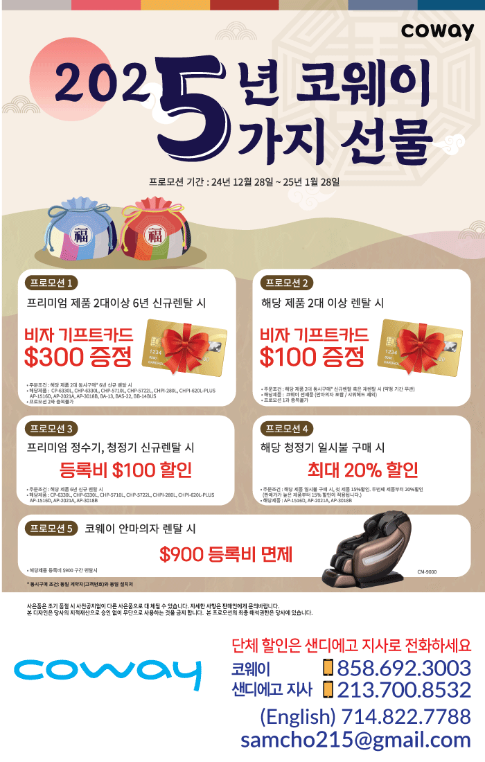 SD 코웨이 신년맞이 대행사 $300 기프트 카드 및 $100 다운페이 할인-해당 프로모션 웅진코웨이SD 세일/쇼핑정보 0 1318 0 0 2024.11.26 17:09 1.석회 중금속을 깨끗하게 걸러주는 그래서 물맛이 깔끔하고 좋은 코웨이 정수기 2.서비스 만족 1위 3. MADE IN KOREA 제품 4. 판매 1위-많은 고객님들이 믿고 쓰는 코웨이 정수 5. 주문 1-2 일 안에 빠른 설치 및 A/S 코웨이 샌디에고 지사가 함께 하겠습니다. 0 0 0 Comments 로그인한 회원만 댓글 등록이 가능합니다. 목록 검색조건 제목 내용 제목+내용 검색어 또는 그리고 검색 번호 제목 이름 날짜 조회 18894 [비지니스광고] 감시카메라 CCTV 선택이 아닌 필수시대 25cctv 876 2024.12.31 25cctv 2024.12.31 876 18893 [세일/쇼핑정보] SD코웨이 공기 청정기 할인 행사 -$200 기프트 카드 증정-… 웅진코웨이SD 1345 2024.12.30 웅진코웨이SD 2024.12.30 1345 18892 [비지니스광고] 콘보이 H마트 근처 방 렌트 합니다 sophiakk 853 2024.12.23 sophiakk 2024.12.23 853 18891 [비지니스광고] 결혼 사진 촬영합니다. 돌, 파티, 행사 사진도 합니다. 믿는사진 772 2024.12.20 믿는사진 2024.12.20 772 18890 [비지니스광고] 부동산면허시험(실시간Online강의)(브로커/에이전트)(맞춤형코… realestatepasse… 879 2024.12.18 realestatepasse… 2024.12.18 879 18889 [타운뉴스] 세무사면허 시험대비반 (Live Online강의)(맞춤형코스)(… EAschool 1251 2024.12.18 EAschool 2024.12.18 1251 18888 [비지니스광고] SD 코웨이 12월 프로모션--메리크리스마스 기프트 및 상품 … 웅진코웨이SD 857 2024.11.26 웅진코웨이SD 2024.11.26 857 18887 [비지니스광고] 반영구 연말 스패셜! Kristyle 796 2024.12.16 Kristyle 2024.12.16 796 18886 [비지니스광고] 보험면허시험반(한국어시험신설) (적중 한국어교재로 최단기 합격 … -nsurance 1045 2024.12.15 -nsurance 2024.12.15 1045 18885 [타운뉴스] 국카스텐 [Guckkasten] 페창가 콘서트 운영자 1198 2024.12.13 운영자 2024.12.13 1198 18884 [비지니스광고] ■온라인 부동산 라이센스 강의!■ 한국어 교재로 한번에 합격 unboring 938 2024.12.12 unboring 2024.12.12 938 18883 [비지니스광고] 특별한 회원을 모집합니다. 어린세포 884 2024.12.10 어린세포 2024.12.10 884 18882 [세일/쇼핑정보] 정관장 연말 크리스마스 세일!! KGCSD 1388 2024.12.09 KGCSD 2024.12.09 1388 18881 [비지니스광고] 푸드핸들러카드 취득(Foodhandler Card) foodhandler 803 2024.12.08 foodhandler 2024.12.08 803 18880 [비지니스광고] ◆◆주택융자◆◆착한 이자율 & 신속 서비스 Loan Fee 안받… DavidYoon 915 2024.12.06 DavidYoon 2024.12.06 915 18879 [비지니스광고] LA 소재 동물병원 수의사 (Veterinarian) 모집: H… 스마트이주공사 845 2024.12.05 스마트이주공사 2024.12.05 845 18878 [비지니스광고] 안경점 창업/매입 --> E-2 투자 비자 신분 변경, 취업이민 스마트이주공사 959 2024.12.03 스마트이주공사 2024.12.03 959 18877 [비지니스광고] 발효녹용 특허 15주년 기념 대세일 Adelapig2 762 2024.12.02 Adelapig2 2024.12.02 762 18876 [비지니스광고] 에어컨과 히터 johnHVACR 866 2024.12.01 johnHVACR 2024.12.01 866 18875 [세일/쇼핑정보] #### 선물이 아닌 마음을 전하세요 ~ 연말 선물로 건강즙 … -illip kim 1141 2024.12.01 -illip kim 2024.12.01 1141 18874 [비지니스광고] 에이전트 모집 glfunding 791 2024.11.30 glfunding 2024.11.30 791 18873 [비지니스광고] 세금문제가 있습니다. 기다려 볼까요? ZippyTax 654 2024.11.30 ZippyTax 2024.11.30 654 18872 [비지니스광고] 파티.웨딩 헤어. 메이크업 루비 794 2024.11.30 루비 2024.11.30 794 18871 [비지니스광고] 회사설립, 세금보고 taxaccounting 808 2024.11.27 taxaccounting 2024.11.27 808 열람중 [세일/쇼핑정보] SD 코웨이 신년맞이 대행사 $300 기프트 카드 및 $100 … 웅진코웨이SD 1319 2024.11.26 웅진코웨이SD 2024.11.26 1319 18869 [비지니스광고] 이민법, 상법, 상속법, 교통사고, 개인 상해, 소송전문 모든 … Cchonglaw2025 906 2024.11.25 Cchonglaw2025 2024.11.25 906 18868 [비지니스광고] 트럼프 시대엔 미국 이민 포기해야 할까? 스마트이주공사 857 2024.11.25 스마트이주공사 2024.11.25 857 18867 [비지니스광고] 라호야 스시가게 급매로 내놓습니다!!!!! NaNaStar 1059 2024.11.25 NaNaStar 2024.11.25 1059 18866 [세일/쇼핑정보] 땡스기빙! 아이폰13 $299 및 요금 할인 안내! 브라이언00 1306 2024.11.23 브라이언00 2024.11.23 1306 18865 [비지니스광고] 미국에서 한국트렌드 의류를 구하기 힘드시다구요? Glance 974 2024.11.18 Glance 2024.11.18 974 18864 [비지니스광고] 반영구 스패셜! Kristyle 802 2024.11.17 Kristyle 2024.11.17 802 18863 [세일/쇼핑정보] 코웨이 정수기 왜 ? 물맛이 깔끔하나요 웅진코웨이SD 1495 2024.11.13 웅진코웨이SD 2024.11.13 1495 18862 [비지니스광고] IRS에서 편지를 받으셨읍니까? 무료 첫 상담 받으세요. ZippyTax 874 2024.11.13 ZippyTax 2024.11.13 874 18861 [비지니스광고] ◆◆부동산 라이센스◆◆ 한국어 강의 듣고, 한 번에 합격! DavidYoon 932 2024.11.12 DavidYoon 2024.11.12 932 18860 [세일/쇼핑정보] 버라이존 무제한 월 $20 및 핸드폰 할인 행사!!! 브라이언00 1343 2024.11.12 브라이언00 2024.11.12 1343 18859 [비지니스광고] 융자면허 쪽집게시험대비반(Live Online강의) (맞춤형코스… -oan school 1026 2024.11.11 -oan school 2024.11.11 1026 18858 [비지니스광고] 한국음식이 필요하면.. 송지아 1401 2024.11.10 송지아 2024.11.10 1401 18857 [비지니스광고] 반영구 연말 스페셜 Kristyle 773 2024.11.10 Kristyle 2024.11.10 773 18856 [비지니스광고] 