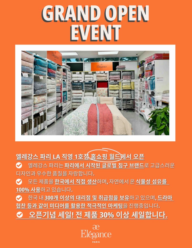 프리미엄 한국 이불 브랜드 홈쇼핑월드에서 만나보세요 EleganceParis 비지니스광고 0 1189 0 0 2024.09.10 22:47 Made in Korea 한국식 차렵이불 엘레강스파리 GRAND OPEN EVENT홈쇼핑월드 LA & 부에나팍에 입점하게 된 엘레강스 파리입니다.그동안 미국에서 한국 이불 구하기 어려우셨을 여러분들을 위해 한국에서 직접 생산 및유통을 하고 있는 엘레강스파리가 홈쇼핑월드에 입점하였습니다. 0 0 0 Comments 로그인한 회원만 댓글 등록이 가능합니다. 목록 검색조건 제목 내용 제목+내용 검색어 또는 그리고 검색 번호 제목 이름 날짜 조회 18834 [비지니스광고] 하이브 노래방 영업시간 yonghoJun 1388 2024.10.17 yonghoJun 2024.10.17 1388 18833 [비지니스광고] 웨딩헤어 메이크업 루비 911 2024.10.17 루비 2024.10.17 911 18832 [비지니스광고] 부동산면허시험(실시간Online강의)(브로커/에이전트)(맞춤형코… realestatepasse… 1002 2024.10.14 realestatepasse… 2024.10.14 1002 18831 [비지니스광고] 겨울이불 한국에서 사오시나요? EleganceParis 1014 2024.10.13 EleganceParis 2024.10.13 1014 18830 [비지니스광고] 엘에이 렌트카 / 얼바인 렌트카 / 풀르턴 렌트카 / 장단기 렌… 만드기 889 2024.10.10 만드기 2024.10.10 889 18829 [비지니스광고] 일주일 만에 승인된 21세 미만 학생 (F-1) 신분변경 스마트이주공사 975 2024.10.10 스마트이주공사 2024.10.10 975 18828 [비지니스광고] ◆◆부동산 라이센스◆◆ 한국어 강의 듣고, 한 번에 합격! DavidYoon 960 2024.10.10 DavidYoon 2024.10.10 960 18827 [비지니스광고] Rockstep Tax 세금보고, 회계사 운영자 947 2024.10.07 운영자 2024.10.07 947 18826 [타운뉴스] 트로트 여왕 장윤정 11월 16일 페창가 리조트 카지노에서 단독… 운영자 1616 2024.10.07 운영자 2024.10.07 1616 18825 [비지니스광고] 회사설립, 세금보고 taxaccounting 935 2024.10.05 taxaccounting 2024.10.05 935 18824 [타운뉴스] ★★ 신봉선 개그우먼과 함께하는 벗투게더 [10월 27일 주일 … 아미쿠스장로교회 1613 2024.10.04 아미쿠스장로교회 2024.10.04 1613 18823 [비지니스광고] 반영구 스페셜 Kristyle 854 2024.10.02 Kristyle 2024.10.02 854 18822 [비지니스광고] 푸드핸들러카드 취득(Foodhandler Card) foodhandler 975 2024.10.02 foodhandler 2024.10.02 975 18821 1 [비지니스광고] MERCHANT SERVICE (카드 터미널, POS 시스템,,… 1 Stevehwang 917 2024.10.02 Stevehwang 2024.10.02 917 18820 [비지니스광고] 샌디에고 ■'다운페이 보조'■ ‘내집 마련의 꿈’ ‘주택박람회’… DavidYoon 1230 2024.10.01 DavidYoon 2024.10.01 1230 18819 [비지니스광고] WOODWARD AUTO CARE 블랙박스 설치(5대 한정) 우드워드 941 2024.10.01 우드워드 2024.10.01 941 18818 [세일/쇼핑정보] SD 코웨이 11월 추수감사절 $340 온열매트 증정 -해당프… 웅진코웨이SD 1293 2024.10.01 웅진코웨이SD 2024.10.01 1293 18817 [비지니스광고] 예뻐지는 시간 인셀덤입니다 꼬생 910 2024.09.30 꼬생 2024.09.30 910 18816 [비지니스광고] San Diego 에서 활동 가능한 프리랜서 번역, 통역사를 모… 진감 1000 2024.09.30 진감 2024.09.30 1000 18815 [비지니스광고] 프리미엄 홈케어 고주파 미용기기 판매 및 현지 파트너분 찾습니다… 손Jake 905 2024.09.26 손Jake 2024.09.26 905 18814 [비지니스광고] ■■■주택융자■■■ Loan Fee 안받습니다! 착한 이자율 &… DavidYoon 1089 2024.09.26 DavidYoon 2024.09.26 1089 18813 [비지니스광고] 일동 아이비엘 마스크 - 프로바이오틱스, 히알루론산 ($15) bliss007 907 2024.09.25 bliss007 2024.09.25 907 18812 [비지니스광고] 반려 동물 의약품 Hunter 957 2024.09.24 Hunter 2024.09.24 957 18811 [비지니스광고] 엘에이 렌트카 / 얼바인 렌트카 / 풀르턴 렌트카 / 장단기 렌… -oyon Kim 989 2024.09.23 -oyon Kim 2024.09.23 989 18810 [세일/쇼핑정보] 울타리몰 Premium K-Food 샌디에고 매장 오픈 운영자 4185 2024.08.23 운영자 2024.08.23 4185 18809 [비지니스광고] 반영구 Fall special!! Kristyle 817 2024.09.22 Kristyle 2024.09.22 817 18808 [비지니스광고] 온라인마케팅 구글 마케팅 랭킹 업! 리뷰 업! 소규모 비즈니스 … 케로비 1017 2024.09.22 케로비 2024.09.22 1017 18807 3 [비지니스광고] *** 바디프렌드&세라젬 샌디에고 *** 3 바디프렌드SD 1094 2024.09.21 바디프렌드SD 2024.09.21 1094 18806 [비지니스광고] 마이클 최, 공인 회계사 입니다 운영자 790 2024.09.21 운영자 2024.09.21 790 18805 [비지니스광고] 한스라벨르 프리미엄 화장품을 소개합니다. 꼬생 2612 2024.09.18 꼬생 2024.09.18 2612 18804 [타운뉴스] 비영리단테 엘림상담센터연례모임 스펀서 모집(10/19/24 J&… 엘림 1496 2024.09.18 엘림 2024.09.18 1496 18803 [비지니스광고] 반영구 Fall Event 스패셜!✨ Kristyle 937 2024.09.17 Kristyle 2024.09.17 937 18802 [비지니스광고] 프로 핸디 청소 전문 가든 인테리어 업체 prohandy66 982 2024.09.17 prohandy66 2024.09.17 982 18801 [비지니스광고] ■■■주택융자■■■ Loan Fee 안받습니다! 착한 이자율 &… unboring 995 2024.09.17 unboring 2024.09.17 995 18800 [타운뉴스] 융자면허 쪽집게시험대비반(Live Online강의) (맞춤형코스… -oan school 1615 2024.09.16 -oan school 2024.09.16 1615 18799 1 [비지니스광고] *** 바디프렌드&세라젬 *** 1 바디프렌드SD 881 2024.09.16 바디프렌드SD 2024.09.16 881 18798 [비지니스광고] 여러분께 법적인 문제의 해결점을 찾아드립니다. (크리스 정 변호… Diamant 1009 2024.09.16 Diamant 2024.09.16 1009 18797 [비지니스광고] 부동산면허시험(실시간Online강의)(브로커/에이전트)(맞춤형코… realestate