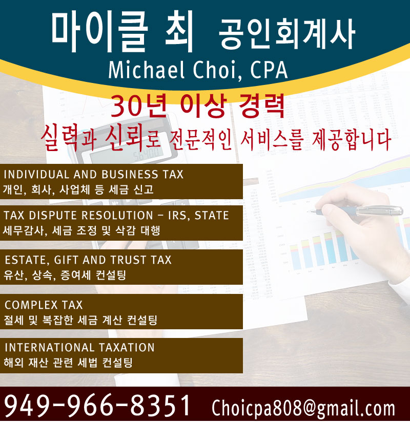 마이클 최, 공인 회계사 입니다 운영자 비지니스광고 0 789 0 0 2024.09.21 11:42 . 0 0 0 Comments 로그인한 회원만 댓글 등록이 가능합니다. 목록 검색조건 제목 내용 제목+내용 검색어 또는 그리고 검색 번호 제목 이름 날짜 조회 18834 [비지니스광고] 하이브 노래방 영업시간 yonghoJun 1388 2024.10.17 yonghoJun 2024.10.17 1388 18833 [비지니스광고] 웨딩헤어 메이크업 루비 911 2024.10.17 루비 2024.10.17 911 18832 [비지니스광고] 부동산면허시험(실시간Online강의)(브로커/에이전트)(맞춤형코… realestatepasse… 1002 2024.10.14 realestatepasse… 2024.10.14 1002 18831 [비지니스광고] 겨울이불 한국에서 사오시나요? EleganceParis 1014 2024.10.13 EleganceParis 2024.10.13 1014 18830 [비지니스광고] 엘에이 렌트카 / 얼바인 렌트카 / 풀르턴 렌트카 / 장단기 렌… 만드기 889 2024.10.10 만드기 2024.10.10 889 18829 [비지니스광고] 일주일 만에 승인된 21세 미만 학생 (F-1) 신분변경 스마트이주공사 975 2024.10.10 스마트이주공사 2024.10.10 975 18828 [비지니스광고] ◆◆부동산 라이센스◆◆ 한국어 강의 듣고, 한 번에 합격! DavidYoon 960 2024.10.10 DavidYoon 2024.10.10 960 18827 [비지니스광고] Rockstep Tax 세금보고, 회계사 운영자 947 2024.10.07 운영자 2024.10.07 947 18826 [타운뉴스] 트로트 여왕 장윤정 11월 16일 페창가 리조트 카지노에서 단독… 운영자 1616 2024.10.07 운영자 2024.10.07 1616 18825 [비지니스광고] 회사설립, 세금보고 taxaccounting 935 2024.10.05 taxaccounting 2024.10.05 935 18824 [타운뉴스] ★★ 신봉선 개그우먼과 함께하는 벗투게더 [10월 27일 주일 … 아미쿠스장로교회 1613 2024.10.04 아미쿠스장로교회 2024.10.04 1613 18823 [비지니스광고] 반영구 스페셜 Kristyle 854 2024.10.02 Kristyle 2024.10.02 854 18822 [비지니스광고] 푸드핸들러카드 취득(Foodhandler Card) foodhandler 975 2024.10.02 foodhandler 2024.10.02 975 18821 1 [비지니스광고] MERCHANT SERVICE (카드 터미널, POS 시스템,,… 1 Stevehwang 917 2024.10.02 Stevehwang 2024.10.02 917 18820 [비지니스광고] 샌디에고 ■'다운페이 보조'■ ‘내집 마련의 꿈’ ‘주택박람회’… DavidYoon 1230 2024.10.01 DavidYoon 2024.10.01 1230 18819 [비지니스광고] WOODWARD AUTO CARE 블랙박스 설치(5대 한정) 우드워드 941 2024.10.01 우드워드 2024.10.01 941 18818 [세일/쇼핑정보] SD 코웨이 11월 추수감사절 $340 온열매트 증정 -해당프… 웅진코웨이SD 1293 2024.10.01 웅진코웨이SD 2024.10.01 1293 18817 [비지니스광고] 예뻐지는 시간 인셀덤입니다 꼬생 910 2024.09.30 꼬생 2024.09.30 910 18816 [비지니스광고] San Diego 에서 활동 가능한 프리랜서 번역, 통역사를 모… 진감 1000 2024.09.30 진감 2024.09.30 1000 18815 [비지니스광고] 프리미엄 홈케어 고주파 미용기기 판매 및 현지 파트너분 찾습니다… 손Jake 905 2024.09.26 손Jake 2024.09.26 905 18814 [비지니스광고] ■■■주택융자■■■ Loan Fee 안받습니다! 착한 이자율 &… DavidYoon 1089 2024.09.26 DavidYoon 2024.09.26 1089 18813 [비지니스광고] 일동 아이비엘 마스크 - 프로바이오틱스, 히알루론산 ($15) bliss007 907 2024.09.25 bliss007 2024.09.25 907 18812 [비지니스광고] 반려 동물 의약품 Hunter 957 2024.09.24 Hunter 2024.09.24 957 18811 [비지니스광고] 엘에이 렌트카 / 얼바인 렌트카 / 풀르턴 렌트카 / 장단기 렌… -oyon Kim 989 2024.09.23 -oyon Kim 2024.09.23 989 18810 [세일/쇼핑정보] 울타리몰 Premium K-Food 샌디에고 매장 오픈 운영자 4185 2024.08.23 운영자 2024.08.23 4185 18809 [비지니스광고] 반영구 Fall special!! Kristyle 817 2024.09.22 Kristyle 2024.09.22 817 18808 [비지니스광고] 온라인마케팅 구글 마케팅 랭킹 업! 리뷰 업! 소규모 비즈니스 … 케로비 1017 2024.09.22 케로비 2024.09.22 1017 18807 3 [비지니스광고] *** 바디프렌드&세라젬 샌디에고 *** 3 바디프렌드SD 1094 2024.09.21 바디프렌드SD 2024.09.21 1094 열람중 [비지니스광고] 마이클 최, 공인 회계사 입니다 운영자 790 2024.09.21 운영자 2024.09.21 790 18805 [비지니스광고] 한스라벨르 프리미엄 화장품을 소개합니다. 꼬생 2612 2024.09.18 꼬생 2024.09.18 2612 18804 [타운뉴스] 비영리단테 엘림상담센터연례모임 스펀서 모집(10/19/24 J&… 엘림 1495 2024.09.18 엘림 2024.09.18 1495 18803 [비지니스광고] 반영구 Fall Event 스패셜!✨ Kristyle 937 2024.09.17 Kristyle 2024.09.17 937 18802 [비지니스광고] 프로 핸디 청소 전문 가든 인테리어 업체 prohandy66 982 2024.09.17 prohandy66 2024.09.17 982 18801 [비지니스광고] ■■■주택융자■■■ Loan Fee 안받습니다! 착한 이자율 &… unboring 995 2024.09.17 unboring 2024.09.17 995 18800 [타운뉴스] 융자면허 쪽집게시험대비반(Live Online강의) (맞춤형코스… -oan school 1615 2024.09.16 -oan school 2024.09.16 1615 18799 1 [비지니스광고] *** 바디프렌드&세라젬 *** 1 바디프렌드SD 880 2024.09.16 바디프렌드SD 2024.09.16 880 18798 [비지니스광고] 여러분께 법적인 문제의 해결점을 찾아드립니다. (크리스 정 변호… Diamant 1009 2024.09.16 Diamant 2024.09.16 1009 18797 [비지니스광고] 부동산면허시험(실시간Online강의)(브로커/에이전트)(맞춤형코… realestatepasse… 1028 2024.09.15 realestatepasse… 2024.09.15 1028 18796 [세일/쇼핑정보] 보보스 노래방 SOFT OPEN NOW !!! 운영자 1366 2024.09.13 운영자 2024.09.13 1366 18795 [비지니스광고] bebesia 돌고래필터샤워기 Full Set 추석맞이 빅세일(… 베베시아 1079 2024.09.13 베베시아 2024.09.13 1079 18794 [비지니스광고] 트럼프가 당선되면 미국