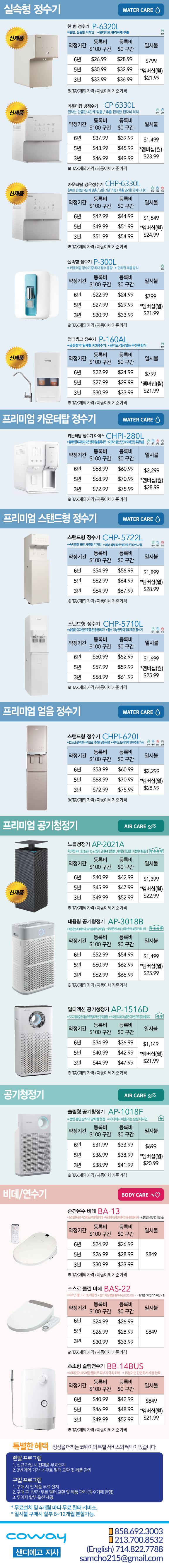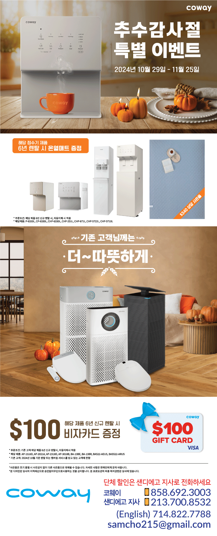 SD 코웨이 11월 추수감사절 $340 온열매트 증정 -해당프로모션 웅진코웨이SD 세일/쇼핑정보 0 1292 0 0 2024.10.01 02:57 1.석회 중금속을 깨끗하게 걸러주는 그래서 물맛이 깔끔하고 좋은 코웨이 정수기 2.서비스 만족 1위 3. MADE IN KOREA 제품 4. 판매 1위-많은 고객님들이 믿고 쓰는 코웨이 정수 5. 주문 1-2 일 안에 빠른 설치 및 A/S 코웨이 샌디에고 지사가 함께 하겠습니다. 0 0 0 Comments 로그인한 회원만 댓글 등록이 가능합니다. 목록 검색조건 제목 내용 제목+내용 검색어 또는 그리고 검색 번호 제목 이름 날짜 조회 18834 [비지니스광고] 하이브 노래방 영업시간 yonghoJun 1387 2024.10.17 yonghoJun 2024.10.17 1387 18833 [비지니스광고] 웨딩헤어 메이크업 루비 911 2024.10.17 루비 2024.10.17 911 18832 [비지니스광고] 부동산면허시험(실시간Online강의)(브로커/에이전트)(맞춤형코… realestatepasse… 1001 2024.10.14 realestatepasse… 2024.10.14 1001 18831 [비지니스광고] 겨울이불 한국에서 사오시나요? EleganceParis 1014 2024.10.13 EleganceParis 2024.10.13 1014 18830 [비지니스광고] 엘에이 렌트카 / 얼바인 렌트카 / 풀르턴 렌트카 / 장단기 렌… 만드기 888 2024.10.10 만드기 2024.10.10 888 18829 [비지니스광고] 일주일 만에 승인된 21세 미만 학생 (F-1) 신분변경 스마트이주공사 975 2024.10.10 스마트이주공사 2024.10.10 975 18828 [비지니스광고] ◆◆부동산 라이센스◆◆ 한국어 강의 듣고, 한 번에 합격! DavidYoon 959 2024.10.10 DavidYoon 2024.10.10 959 18827 [비지니스광고] Rockstep Tax 세금보고, 회계사 운영자 947 2024.10.07 운영자 2024.10.07 947 18826 [타운뉴스] 트로트 여왕 장윤정 11월 16일 페창가 리조트 카지노에서 단독… 운영자 1615 2024.10.07 운영자 2024.10.07 1615 18825 [비지니스광고] 회사설립, 세금보고 taxaccounting 934 2024.10.05 taxaccounting 2024.10.05 934 18824 [타운뉴스] ★★ 신봉선 개그우먼과 함께하는 벗투게더 [10월 27일 주일 … 아미쿠스장로교회 1611 2024.10.04 아미쿠스장로교회 2024.10.04 1611 18823 [비지니스광고] 반영구 스페셜 Kristyle 854 2024.10.02 Kristyle 2024.10.02 854 18822 [비지니스광고] 푸드핸들러카드 취득(Foodhandler Card) foodhandler 975 2024.10.02 foodhandler 2024.10.02 975 18821 1 [비지니스광고] MERCHANT SERVICE (카드 터미널, POS 시스템,,… 1 Stevehwang 917 2024.10.02 Stevehwang 2024.10.02 917 18820 [비지니스광고] 샌디에고 ■'다운페이 보조'■ ‘내집 마련의 꿈’ ‘주택박람회’… DavidYoon 1229 2024.10.01 DavidYoon 2024.10.01 1229 18819 [비지니스광고] WOODWARD AUTO CARE 블랙박스 설치(5대 한정) 우드워드 941 2024.10.01 우드워드 2024.10.01 941 열람중 [세일/쇼핑정보] SD 코웨이 11월 추수감사절 $340 온열매트 증정 -해당프… 웅진코웨이SD 1293 2024.10.01 웅진코웨이SD 2024.10.01 1293 18817 [비지니스광고] 예뻐지는 시간 인셀덤입니다 꼬생 910 2024.09.30 꼬생 2024.09.30 910 18816 [비지니스광고] San Diego 에서 활동 가능한 프리랜서 번역, 통역사를 모… 진감 999 2024.09.30 진감 2024.09.30 999 18815 [비지니스광고] 프리미엄 홈케어 고주파 미용기기 판매 및 현지 파트너분 찾습니다… 손Jake 904 2024.09.26 손Jake 2024.09.26 904 18814 [비지니스광고] ■■■주택융자■■■ Loan Fee 안받습니다! 착한 이자율 &… DavidYoon 1089 2024.09.26 DavidYoon 2024.09.26 1089 18813 [비지니스광고] 일동 아이비엘 마스크 - 프로바이오틱스, 히알루론산 ($15) bliss007 907 2024.09.25 bliss007 2024.09.25 907 18812 [비지니스광고] 반려 동물 의약품 Hunter 956 2024.09.24 Hunter 2024.09.24 956 18811 [비지니스광고] 엘에이 렌트카 / 얼바인 렌트카 / 풀르턴 렌트카 / 장단기 렌… -oyon Kim 988 2024.09.23 -oyon Kim 2024.09.23 988 18810 [세일/쇼핑정보] 울타리몰 Premium K-Food 샌디에고 매장 오픈 운영자 4184 2024.08.23 운영자 2024.08.23 4184 18809 [비지니스광고] 반영구 Fall special!! Kristyle 817 2024.09.22 Kristyle 2024.09.22 817 18808 [비지니스광고] 온라인마케팅 구글 마케팅 랭킹 업! 리뷰 업! 소규모 비즈니스 … 케로비 1016 2024.09.22 케로비 2024.09.22 1016 18807 3 [비지니스광고] *** 바디프렌드&세라젬 샌디에고 *** 3 바디프렌드SD 1093 2024.09.21 바디프렌드SD 2024.09.21 1093 18806 [비지니스광고] 마이클 최, 공인 회계사 입니다 운영자 789 2024.09.21 운영자 2024.09.21 789 18805 [비지니스광고] 한스라벨르 프리미엄 화장품을 소개합니다. 꼬생 2612 2024.09.18 꼬생 2024.09.18 2612 18804 [타운뉴스] 비영리단테 엘림상담센터연례모임 스펀서 모집(10/19/24 J&… 엘림 1493 2024.09.18 엘림 2024.09.18 1493 18803 [비지니스광고] 반영구 Fall Event 스패셜!✨ Kristyle 936 2024.09.17 Kristyle 2024.09.17 936 18802 [비지니스광고] 프로 핸디 청소 전문 가든 인테리어 업체 prohandy66 982 2024.09.17 prohandy66 2024.09.17 982 18801 [비지니스광고] ■■■주택융자■■■ Loan Fee 안받습니다! 착한 이자율 &… unboring 995 2024.09.17 unboring 2024.09.17 995 18800 [타운뉴스] 융자면허 쪽집게시험대비반(Live Online강의) (맞춤형코스… -oan school 1614 2024.09.16 -oan school 2024.09.16 1614 18799 1 [비지니스광고] *** 바디프렌드&세라젬 *** 1 바디프렌드SD 880 2024.09.16 바디프렌드SD 2024.09.16 880 18798 [비지니스광고] 여러분께 법적인 문제의 해결점을 찾아드립니다. (크리스 정 변호… Diamant 1009 2024.09.16 Diamant 2024.09.16 1009 18797 [비지니스광고] 부동산면허시험(실시간Online강의)(브로커/에이전트)(맞춤형코… realestatepasse… 1028 2024