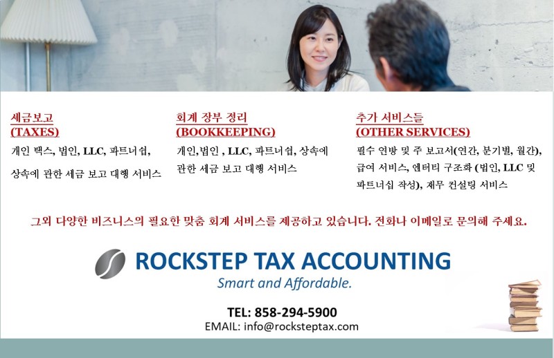 Rockstep Tax 세금보고, 회계사 운영자 비지니스광고 0 947 0 0 2024.10.07 14:51 전화 : 858-294-5922이메일 : info@rocksteptax.com웹사이트 가기 : www.ROCKSTEPTAX.com 0 0 세금보고, 텍스, Tax, Bookkeeping, 회계장부, 개인, 법인 0 Comments 로그인한 회원만 댓글 등록이 가능합니다. 목록 검색조건 제목 내용 제목+내용 검색어 또는 그리고 검색 번호 제목 이름 날짜 조회 18836 [비지니스광고] San Diego에 있는 비즈니스 매물들 Realtor 1065 2024.10.18 Realtor 2024.10.18 1065 18835 1 [세일/쇼핑정보] 2024 HYUNDAI IONIQ5 SEL RWD LEASE S… 1 -ean Lee 1261 2024.10.18 -ean Lee 2024.10.18 1261 18834 [비지니스광고] 하이브 노래방 영업시간 yonghoJun 1392 2024.10.17 yonghoJun 2024.10.17 1392 18833 [비지니스광고] 웨딩헤어 메이크업 루비 913 2024.10.17 루비 2024.10.17 913 18832 [비지니스광고] 부동산면허시험(실시간Online강의)(브로커/에이전트)(맞춤형코… realestatepasse… 1006 2024.10.14 realestatepasse… 2024.10.14 1006 18831 [비지니스광고] 겨울이불 한국에서 사오시나요? EleganceParis 1018 2024.10.13 EleganceParis 2024.10.13 1018 18830 [비지니스광고] 엘에이 렌트카 / 얼바인 렌트카 / 풀르턴 렌트카 / 장단기 렌… 만드기 894 2024.10.10 만드기 2024.10.10 894 18829 [비지니스광고] 일주일 만에 승인된 21세 미만 학생 (F-1) 신분변경 스마트이주공사 979 2024.10.10 스마트이주공사 2024.10.10 979 18828 [비지니스광고] ◆◆부동산 라이센스◆◆ 한국어 강의 듣고, 한 번에 합격! DavidYoon 963 2024.10.10 DavidYoon 2024.10.10 963 열람중 [비지니스광고] Rockstep Tax 세금보고, 회계사 운영자 948 2024.10.07 운영자 2024.10.07 948 18826 [타운뉴스] 트로트 여왕 장윤정 11월 16일 페창가 리조트 카지노에서 단독… 운영자 1617 2024.10.07 운영자 2024.10.07 1617 18825 [비지니스광고] 회사설립, 세금보고 taxaccounting 939 2024.10.05 taxaccounting 2024.10.05 939 18824 [타운뉴스] ★★ 신봉선 개그우먼과 함께하는 벗투게더 [10월 27일 주일 … 아미쿠스장로교회 1614 2024.10.04 아미쿠스장로교회 2024.10.04 1614 18823 [비지니스광고] 반영구 스페셜 Kristyle 857 2024.10.02 Kristyle 2024.10.02 857 18822 [비지니스광고] 푸드핸들러카드 취득(Foodhandler Card) foodhandler 979 2024.10.02 foodhandler 2024.10.02 979 18821 1 [비지니스광고] MERCHANT SERVICE (카드 터미널, POS 시스템,,… 1 Stevehwang 923 2024.10.02 Stevehwang 2024.10.02 923 18820 [비지니스광고] 샌디에고 ■'다운페이 보조'■ ‘내집 마련의 꿈’ ‘주택박람회’… DavidYoon 1235 2024.10.01 DavidYoon 2024.10.01 1235 18819 [비지니스광고] WOODWARD AUTO CARE 블랙박스 설치(5대 한정) 우드워드 945 2024.10.01 우드워드 2024.10.01 945 18818 [세일/쇼핑정보] SD 코웨이 11월 추수감사절 $340 온열매트 증정 -해당프… 웅진코웨이SD 1296 2024.10.01 웅진코웨이SD 2024.10.01 1296 18817 [비지니스광고] 예뻐지는 시간 인셀덤입니다 꼬생 913 2024.09.30 꼬생 2024.09.30 913 18816 [비지니스광고] San Diego 에서 활동 가능한 프리랜서 번역, 통역사를 모… 진감 1004 2024.09.30 진감 2024.09.30 1004 18815 [비지니스광고] 프리미엄 홈케어 고주파 미용기기 판매 및 현지 파트너분 찾습니다… 손Jake 911 2024.09.26 손Jake 2024.09.26 911 18814 [비지니스광고] ■■■주택융자■■■ Loan Fee 안받습니다! 착한 이자율 &… DavidYoon 1092 2024.09.26 DavidYoon 2024.09.26 1092 18813 [비지니스광고] 일동 아이비엘 마스크 - 프로바이오틱스, 히알루론산 ($15) bliss007 907 2024.09.25 bliss007 2024.09.25 907 18812 [비지니스광고] 반려 동물 의약품 Hunter 962 2024.09.24 Hunter 2024.09.24 962 18811 [비지니스광고] 엘에이 렌트카 / 얼바인 렌트카 / 풀르턴 렌트카 / 장단기 렌… -oyon Kim 994 2024.09.23 -oyon Kim 2024.09.23 994 18810 [세일/쇼핑정보] 울타리몰 Premium K-Food 샌디에고 매장 오픈 운영자 4191 2024.08.23 운영자 2024.08.23 4191 18809 [비지니스광고] 반영구 Fall special!! Kristyle 818 2024.09.22 Kristyle 2024.09.22 818 18808 [비지니스광고] 온라인마케팅 구글 마케팅 랭킹 업! 리뷰 업! 소규모 비즈니스 … 케로비 1022 2024.09.22 케로비 2024.09.22 1022 18807 3 [비지니스광고] *** 바디프렌드&세라젬 샌디에고 *** 3 바디프렌드SD 1097 2024.09.21 바디프렌드SD 2024.09.21 1097 18806 [비지니스광고] 마이클 최, 공인 회계사 입니다 운영자 794 2024.09.21 운영자 2024.09.21 794 18805 [비지니스광고] 한스라벨르 프리미엄 화장품을 소개합니다. 꼬생 2614 2024.09.18 꼬생 2024.09.18 2614 18804 [타운뉴스] 비영리단테 엘림상담센터연례모임 스펀서 모집(10/19/24 J&… 엘림 1498 2024.09.18 엘림 2024.09.18 1498 18803 [비지니스광고] 반영구 Fall Event 스패셜!✨ Kristyle 941 2024.09.17 Kristyle 2024.09.17 941 18802 [비지니스광고] 프로 핸디 청소 전문 가든 인테리어 업체 prohandy66 985 2024.09.17 prohandy66 2024.09.17 985 18801 [비지니스광고] ■■■주택융자■■■ Loan Fee 안받습니다! 착한 이자율 &… unboring 997 2024.09.17 unboring 2024.09.17 997 18800 [타운뉴스] 융자면허 쪽집게시험대비반(Live Online강의) (맞춤형코스… -oan school 1621 2024.09.16 -oan school 2024.09.16 1621 18799 1 [비지니스광고] *** 바디프렌드&세라젬 *** 1 바디프렌드SD 884 2024.09.16 바디프렌드SD 2024.09.16 884 18798 [비지니스광고] 여러분께 법적인 문제의 해결점을 찾아드립니다. (크리스 정 변호… Diamant 1013 2024.09.16 Diamant 2024.09.16 1013 18797 [비지니스광고] 부동산면허시험(실시간Online강의)(브로커/에이전트)(맞춤형코… reale