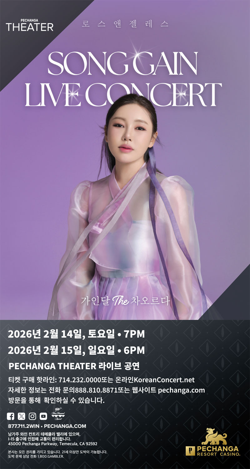 국민 트로트 여제송가인이 오는 2026 2 14() 저녁 7, 이어서 2 15() 저녁 6, 미국 최대 규모 리조트 중 하나인 페창가 리조트 카지노에 위치한 페창가 극장(Pechanga Theater)에서 단독 콘서트를 개최한다.