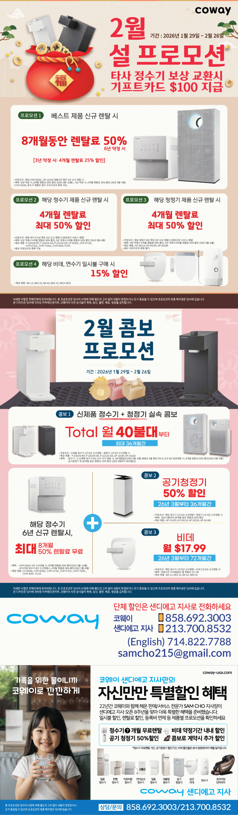 SD 코웨이 2월 타사 보상 기프트 $100--8개월 50% 렌탈료 할인 -해당 정수기