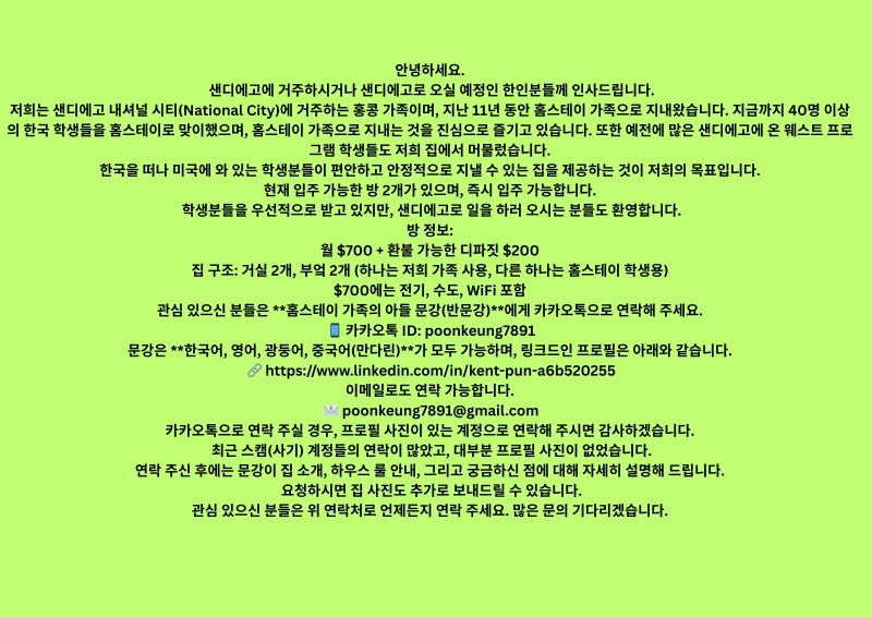 샌디에고 홈스테이 방 2개 즉시 입주 가능 – 한국 학생/직장인 환영 KeungKeung 렌트 0 221 03.13 11:25 체 내용은 첫 번째 사진을 확인해 주세요~ 관심 있으신 분들은 위 연락처로 언제든지 연락 주세요. 많은 문의 기다리겠습니다. 0 Comments 로그인한 회원만 댓글 등록이 가능합니다. 목록 검색조건 제목 내용 제목+내용 검색어 또는 그리고 검색 번호 제목 이름 날짜 조회 155808 사고/팔고 가정용품 babynmom 163 03.16 babynmom 03.16 163 155807 2 사고/팔고 KIRBY Vacuum 무료 2 wind 208 03.16 wind 03.16 208 155806 2 사고/팔고 사무실 가구 책상 책장 무료 2 wind 226 03.16 wind 03.16 226 155805 사고/팔고 시월드 티켓 7장 구해요 yumiio 33 03.16 yumiio 03.16 33 155804 렌트 파사데나 아트센타 칼리지 도보 15분거리 럭셔리 콘도 1베드룸 … 럽골 109 03.16 럽골 03.16 109 155803 사고/팔고 냉동고 필요합니다 Fpt478eq 81 03.16 Fpt478eq 03.16 81 155802 구인/구직 [랜초버나도] 프랜차이즈 주방에서 분식, 샌드위치 하실분과 매니… JJGroup 299 03.16 JJGroup 03.16 299 155801 구인/구직 청소년 무료 치과 검진/스케일링 안내 Jylh 91 03.16 Jylh 03.16 91 155800 구인/구직 일식당 쉐프님을 구인합니다. 무명씨 187 03.16 무명씨 03.16 187 155799 구인/구직 Operations Coordinator에 지원하실분 찿습니다[… AMSLEO 284 03.15 AMSLEO 03.15 284 155798 사고/팔고 ●●● 야외용 나무 벤치 팔아요! 아랑이사랑 299 03.15 아랑이사랑 03.15 299 155797 사고/팔고 미국달러 3200 한화로 환전합니다~ mench9922 140 03.15 mench9922 03.15 140 155796 일반 구하기 힘든 한국 육아 용품/전집, 유아 가구 공구 정보 공유해… 디초이 79 03.15 디초이 03.15 79 155795 사고/팔고 강아지 3in in carrier 겨울동화 146 03.15 겨울동화 03.15 146 155794 구인/구직 파트 타임 스시 쉐프 kildong 244 03.15 kildong 03.15 244 155793 렌트 방 렌트합니다(남자분)-3/22부터 입주가능 Foursranch 115 03.15 Foursranch 03.15 115 155792 사고/팔고 미니미사지 겨울동화 221 03.15 겨울동화 03.15 221 155791 렌트 Single Bedroom Available - Carmel V… DonHan90 130 03.14 DonHan90 03.14 130 155790 사고/팔고 뒷마당 호스 겨울동화 180 03.14 겨울동화 03.14 180 155789 사고/팔고 에스콘디도지역 Smart &Final 마켓스시 판매 -oosuklee 82 03.14 -oosuklee 03.14 82 155788 구인/구직 [HTNS] LA본사-수출입 물류/포워딩 인재 상시채용 공고 (… PeterKwon 242 03.14 PeterKwon 03.14 242 155787 구인/구직 라인 서버 구인 CLYK 176 03.14 CLYK 03.14 176 155786 렌트 ucsd, utc 근처 방렌트 $750 junlin 142 03.14 junlin 03.14 142 155785 사고/팔고 환전(제가 달러) 1777 51 03.14 1777 03.14 51 155784 렌트 출라 비스타에 방이 필요하시면 연락주세요 좋은방 126 03.13 좋은방 03.13 126 155783 구인/구직 마켓 스시 직원 구합니다 minh1995 316 03.13 minh1995 03.13 316 155782 구인/구직 살림 도와주실 분 찾습니다 (파트타임) bambie123 426 03.13 bambie123 03.13 426 155781 렌트 깨끗하고 조용한 방 렌트 합니다 Abyss 153 03.13 Abyss 03.13 153 열람중 렌트 샌디에고 홈스테이 방 2개 즉시 입주 가능 – 한국 학생/직장인… KeungKeung 222 03.13 KeungKeung 03.13 222 155779 렌트 방하나렌트합니다 파란하늘 163 03.12 파란하늘 03.12 163 155778 사고/팔고 USD $3200 판매 / 470만원 / Wise 즉시 송금 /… mench9922 256 03.12 mench9922 03.12 256 155777 구인/구직 주1회 12개월 아기 돌봐주실 분을 찾습니다 리틀터틀 396 03.12 리틀터틀 03.12 396 155776 사고/팔고 카멜 밸리 지역 환전하실 분(제가 달러) MStheone 84 03.12 MStheone 03.12 84 155775 구인/구직 세탁소 카운터 구합니다. -ruce 259 03.12 -ruce 03.12 259 155774 구인/구직 도우미 구함 Sunhee 391 03.12 Sunhee 03.12 391 155773 구인/구직 강아지 돌봐주실분 구합니다.(3/30-4/4)-카멜벨리 Sarahcci 411 03.12 Sarahcci 03.12 411 155772 구인/구직 스시 셰프 풀 타임 구합니다 Puppy1 208 03.12 Puppy1 03.12 208 155771 렌트 UTC 지역 5/4-5/20에 들어갈 단기 서브리스/렌트 구합니… sdsn 101 03.12 sdsn 03.12 101 155770 사고/팔고 다독다독 언어 (활동북 새것) lenaone 90 03.12 lenaone 03.12 90 155769 구인/구직 미 육군 모집 / 17-42세 / 대학 학비 지원 / 최대 $5… SSGLEE 130 03.12 SSGLEE 03.12 130 155768 렌트 3월11일입주 클레어몬트(남성) poohaha 92 03.12 poohaha 03.12 92 155767 1 렌트 여름방학(7.8~8.8) 단기 렌트 서블렛 구해봅니다 1 youngmen 174 03.12 youngmen 03.12 174 155766 7 사고/팔고 Wise USD 3000 판매합니다 한국 계좌 거래 가능 7 mench9922 521 03.11 mench9922 03.11 521 155765 구인/구직 스시 셰프님 과 주방일 하실분을 찾습니다 Fallbrook2021 292 03.11 Fallbrook2021 03.11 292 155764 구인/구직 [구인]Boba/Dessert가게 - Assistant Mana… FvSrlDna 366 03.11 FvSrlDna 03.11 366 155763 렌트 렌쵸 페나스퀴토 지역 깨끗한 방 렌트합니다 Hyki 151 03.11 Hyki 03.11 151 155762 구인/구직 그래픽 디자이너 & 세일즈 / WIGUSA WIGUSA 160 03.11 WIGUSA 03.11 160 155761 사고/팔고 환전 원합니다(제가 달러) sheepLo 89 03.11 sheepLo 03.11 89 155760 렌트 메사컬리지/콘보이근처/엄청크고 예쁜방/가구완비/남여 OK -oksun Jung 176 03.11 -oksun Jung 03.11 176 155759 사고/팔고 어린이 실내 정글짐 hera 172 03.11 hera 03.11 172 155758 사고/팔고 트램펄린 hera 157 03.11 hera 03.11 157 155757 사고/팔고 Propose or Engagement Ring for Sale -race Song 240 03.10 -race Song 03.10 240 155756 1 사고/팔고 ■■■■■ 2013 Volvo 세단 팔아요 1 -hristina 287 03.10 -hristina 03.10 287 155755 사고/팔고 colonial costume (5학년 행사) 샌디10 88 03.10 샌디10 03.10 88 1557