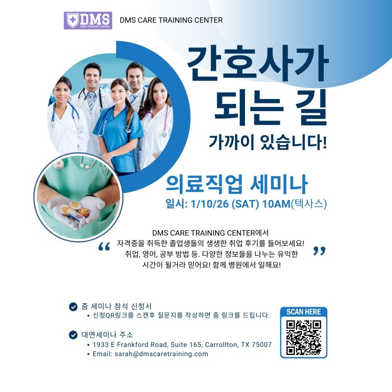 이번 세미나는 DMS Care Training Center에서 CNA 및 Pharmacy Technician 자격증을 취득한 졸업생들의 실제 취업 경험을 직접 들어보는 시간으로 준비되었습니다.
