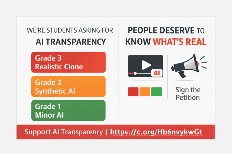 우리는 그저 우리가 보고 있는 것이 실제인지 아니면 AI가 만든 것인지 알 수 있는 쉬운 방법을 원할 뿐입니다. 저희는 누구나 이해할 수 있는 간단한 색상 라벨 시스템을 제안합니다.