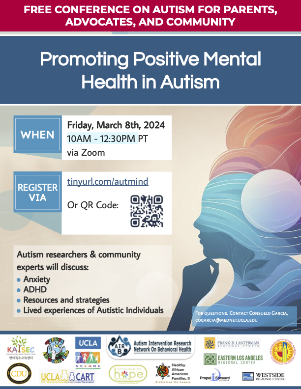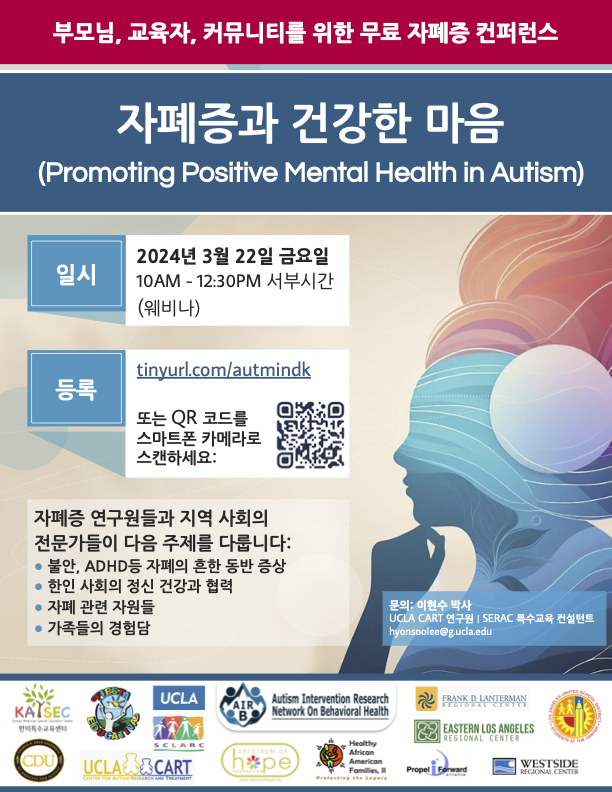 UCLA Center for Autism Research and Treatment (CART 자폐증연구치료센터)와지역사회연합인AIR-B 네트워크의10번째자폐증컨퍼런스를올해도한국어로제공하게되었습니다. ‘자폐증과건강한마음’이라는주제로자폐증연구원, 커뮤니티전문가, 가족들과정신건강에대한이야기를나누는시간을가질것입니다.
