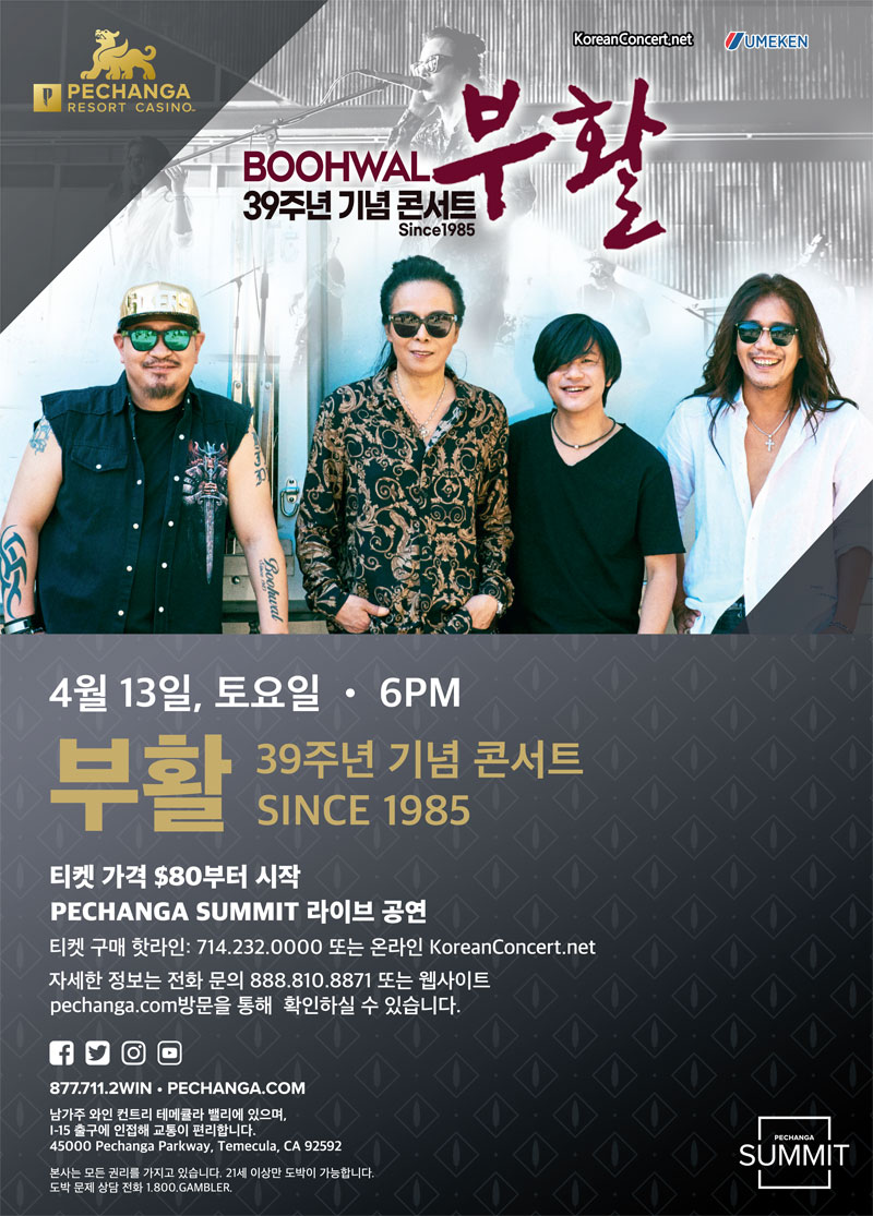 대한민국 록의 전설 ‘부활’이 오는 4월 13일 (토, 저녁 6시), Pechanga 리조트 카지노의 초대형 공연장 Pechanga Summit에서 39주년 기념 라이브 콘서트를 연다.