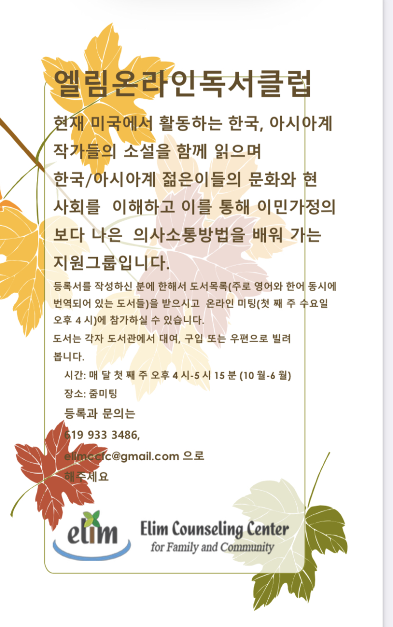 엘림온라인 독서클럽 첫 째 수요일 오후 4시 30분