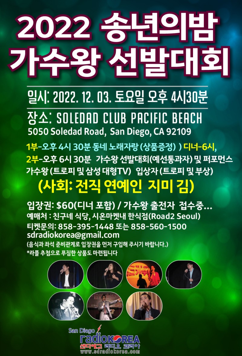 sd radiokorea 송년 가수왕 선발대회가 12월3일 솔리대드 클럽하우스에서 열립니다.