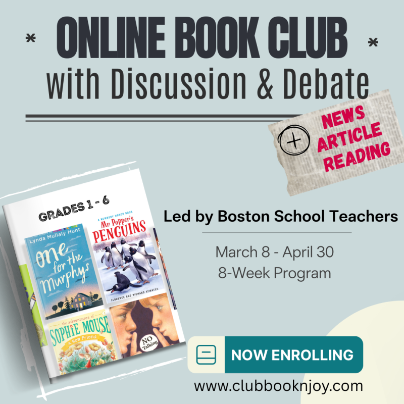 보스턴 대학교수와 매사추세츠 현직초등학교 선생님들이 모여 만든 온라인 북클럽, Club Book & Joy입니다. 8주간 책 네권의 소설책 (주로 수상작들)을 읽고. 디스커션/디베이팅하며.