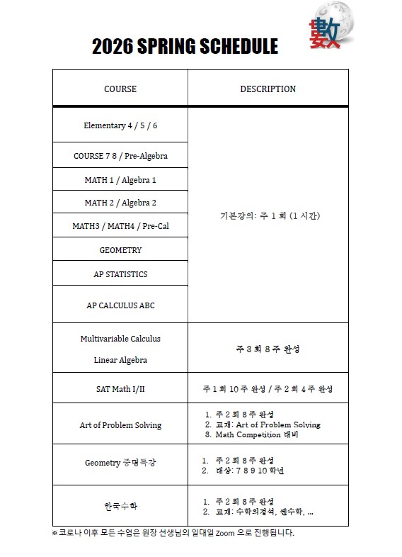 벌써 3월이 되었네요. 수학 공간 Spring 2026 스케줄 공유합니다: