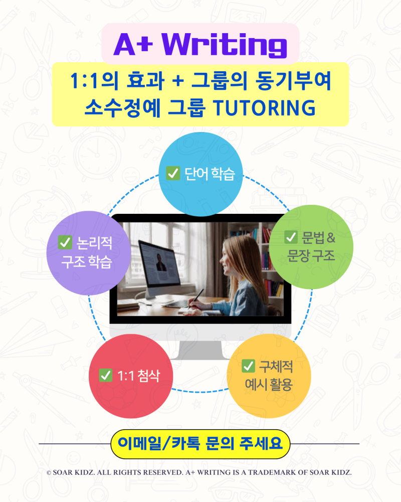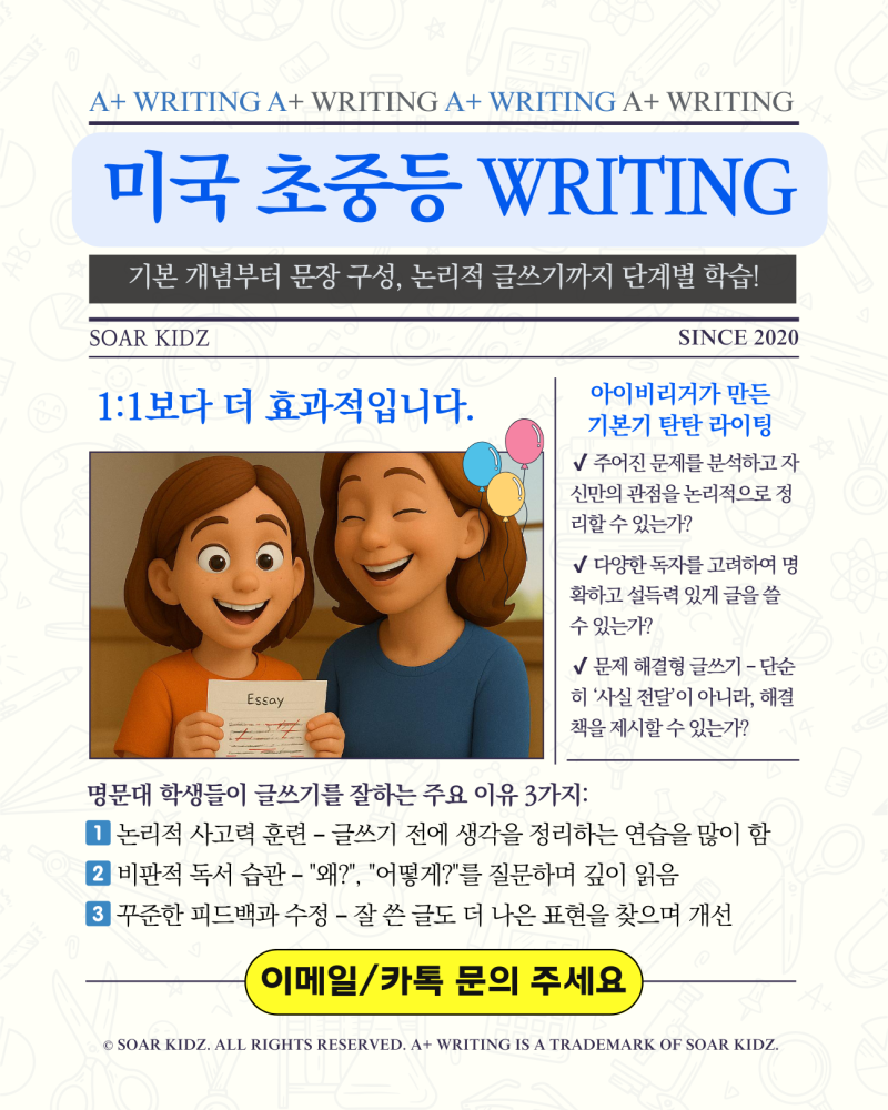 초중등 아이들에게 꼭 맞는 소수정예 Writing Program [A+ Writing]을 만들었습니다.