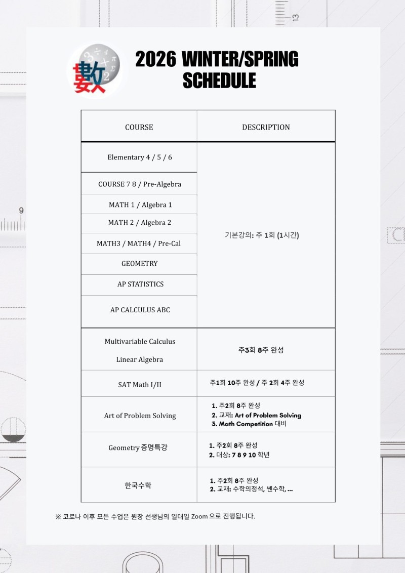 새 학기를 맞이하여 Winter/Spring 2026 스케줄을 공개합니다.