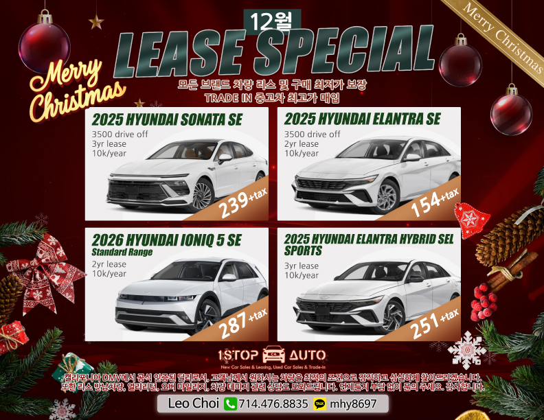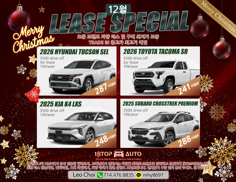 12월 성탄절 맞이 모든 차량 리스 및 구매 최저가 보장합니다 중고차 최고가 매입 무료 리스 리턴 Leo 에게 문의 하세요