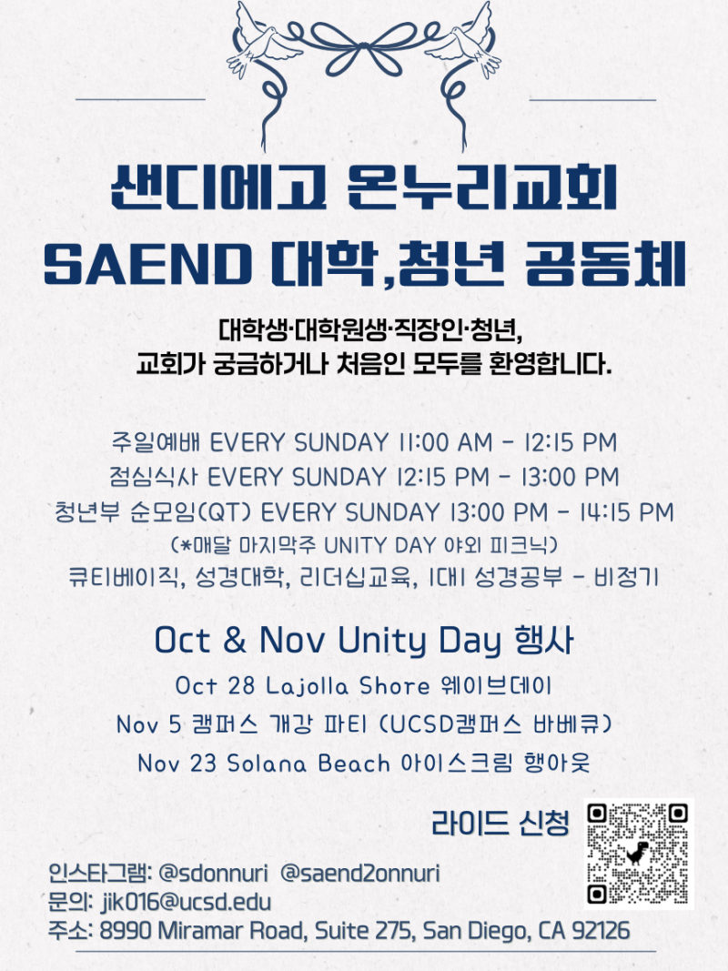 샌디에고 온누리교회 대학,청년부 Joseph2 교회 0 542 2025.10.19 19:51 샌디에고 온누리교회 대학,청년부에 초청합니다. 0 Comments 로그인한 회원만 댓글 등록이 가능합니다. 목록 검색조건 제목 내용 제목+내용 검색어 또는 그리고 검색 번호 제목 이름 날짜 조회 3220 [교회] 어디에 살 것인가 이것이 문제로다. HIJCC10635 291 2025.12.10 HIJCC10635 2025.12.10 291 3219 [교회] 믿음으로 도전하라(생명의삶,12/08,월) *예수생명 내생명 우… 비전맨 330 2025.12.07 비전맨 2025.12.07 330 3218 [불교] 샌디에고 관음사 12월 동지 법회 안내_12/20/25 토요일 BodhiHeart 347 2025.12.07 BodhiHeart 2025.12.07 347 3217 [교회] 생명의 삶 12월 스페셜(Special) SD베델교회 297 2025.12.03 SD베델교회 2025.12.03 297 3216 [교회] 수13:1-33, 끝까지 사명 감당(생삶,12/04,목) *예수… 비전맨 331 2025.12.01 비전맨 2025.12.01 331 3215 [교회] SD 베델교회 추수감사주일 SD베델교회 332 2025.11.29 SD베델교회 2025.11.29 332 3214 [교회] 수8:18-35,승리 후 언약 갱신(생삶,11/25,화) *예수… 비전맨 348 2025.11.24 비전맨 2025.11.24 348 3213 [교회] 그가 주를 만나기 전까지는! HIJCC10635 341 2025.11.24 HIJCC10635 2025.11.24 341 3212 [교회] 수6:15-27,믿음으로 순종한 대반전(생삶,11/20,목) *… 비전맨 363 2025.11.19 비전맨 2025.11.19 363 3211 [희망의글] ++ 기도로 거룩한 삶을 ++ -ilgrim 545 2025.11.12 -ilgrim 2025.11.12 545 3210 [교회] 수2:8-14, 삶을 바꾼 하룻 밤의 고백(생삶,11/12,수)… 비전맨 378 2025.11.12 비전맨 2025.11.12 378 3209 [교회] 예산 부족이나 셧다운이 일어나지 않는 천국으로 초대 HIJCC10635 393 2025.11.10 HIJCC10635 2025.11.10 393 3208 [알림] 세미나와 콘서트 theway 462 2025.11.04 theway 2025.11.04 462 3207 [교회] 개혁주의 요한계시록 강해 (51) - 엘센트로 한인교회 이용호 … TheBible 417 2025.11.04 TheBible 2025.11.04 417 3206 [교회] 언제나 환영해요! HIJCC10635 447 2025.11.03 HIJCC10635 2025.11.03 447 3205 [교회] 딤후2:14-26, ‘귀히 쓰는 그릇’ 사용 설명서(생명의삶,1… 비전맨 397 2025.11.03 비전맨 2025.11.03 397 3204 [불교] 샌디에고 관음사 11월 법회 안내/ 11월15일 토요일 BodhiHeart 338 2025.11.02 BodhiHeart 2025.11.02 338 3203 [교회] [주사랑교회] 할렐루야나잇!!! Trunk or treat 주사랑교회목회실 397 2025.11.02 주사랑교회목회실 2025.11.02 397 3202 [교회] 생명의 삶 11월 스페셜(Special) SD베델교회 356 2025.11.01 SD베델교회 2025.11.01 356 3201 [알림] 예배 세미나 및 가을 콘서트가 열립니다 theway 408 2025.10.30 theway 2025.10.30 408 3200 [교회] 쌀의 단 맛을 느끼려면 HIJCC10635 375 2025.10.27 HIJCC10635 2025.10.27 375 3199 [교회] 슥14:1-9, 그날, 심판을 넘어 생수의 강으로(생명의삶,10… 비전맨 448 2025.10.27 비전맨 2025.10.27 448 3198 [교회] 개혁주의 요한계시록 강해 (50) - 엘센트로 한인교회 이용호 … TheBible 389 2025.10.25 TheBible 2025.10.25 389 3197 [교회] 선교사 초청 간증집회에 초청합니다-출라비스타장로교회 비전맨 372 2025.10.25 비전맨 2025.10.25 372 3196 [알림] 팀룩 워십 찬양 집회 ElkumSDCKC 524 2025.10.21 ElkumSDCKC 2025.10.21 524 3195 [교회] 슥7:1-14, 금식 보다 순종(생명의삶,10/20,월) *예수… 비전맨 465 2025.10.20 비전맨 2025.10.20 465 열람중 [교회] 샌디에고 온누리교회 대학,청년부 Joseph2 543 2025.10.19 Joseph2 2025.10.19 543 3193 [교회] 개혁주의 요한계시록 강해 (49) - 엘센트로 한인교회 이용호 … TheBible 367 2025.10.18 TheBible 2025.10.18 367 3192 [교회] 슥3:1-10,그슬린 나무의 극적 반전(생삶,10/16,목) *… 비전맨 455 2025.10.15 비전맨 2025.10.15 455 3191 [교회] 성장 HIJCC10635 388 2025.10.13 HIJCC10635 2025.10.13 388 3190 [교회] 크리스천 부모교육 세미나(Zoom 무료) 빈들소리 455 2025.10.11 빈들소리 2025.10.11 455 3189 [교회] 개혁주의 요한계시록 강해 (48) - 엘센트로 한인교회 이용호 … TheBible 429 2025.10.08 TheBible 2025.10.08 429 3188 [교회] 샌디에고 샘물교회 목요찬양 이번 주간에 모임(10/9)이 없습니… pchoi 476 2025.10.07 pchoi 2025.10.07 476 3187 [교회] 수고하며 무거운 짐을 진 사람은 내게 오라 HIJCC10635 473 2025.10.06 HIJCC10635 2025.10.06 473 3186 [교회] 샌디에고 베델교회 찬양예배&Patio Party SD베델교회 483 2025.10.04 SD베델교회 2025.10.04 483 3185 [교회] [주사랑교회] 할렐루야나잇 트렁크오어트릿!! 주사랑교회목회실 507 2025.10.02 주사랑교회목회실 2025.10.02 507 3184 [교회] 개혁주의 요한계시록 강해 (47) - 엘센트로 한인교회 이용호 … TheBible 365 2025.10.02 TheBible 2025.10.02 365 3183 [교회] 생명의 삶 10월 스페셜(Special) SD베델교회 397 2025.10.02 SD베델교회 2025.10.02 397 3182 [교회] 롬12:1-8 <은혜받은 자의 거룩한 삶>(생삶,10/1,수) … 비전맨 491 2025.09.29 비전맨 2025.09.29 491 3181 [희망의글] 상처치유 동글이 417 2025.09.28 동글이 2025.09.28 417 3180 [교회] 하늘의 문(The Gate of Heaven) HIJCC10635 492 2025.09.27 HIJCC10635 2025.09.27 492 3179 [교회] 개혁주의 요한계시록 강해 (46) - 엘센트로 한인교회 이용호 … TheBible 416 2025.09.25 TheBible 2025.09.25 416 3178 1 [교회] '없음'이 두려움을 키울 때, '있음'으로 찬송과 감사가 나오게… 1 HIJCC10635 396 2025.09.23 HIJCC10635 2025.09.23 396 3177 [교회] SD 베델교회 찬양 예배 & Patio Party SD베델교회 426 2025.09.22 SD베델교회 2025.09.22 426 3176 [교회] 목요 찬양에 초대합니다[샌디에고 샘물교회] pchoi 450 2025.09.21 pchoi 2025.09.21 450 3175 [교회] 초청강사에게 듣습니다. popopu 404 2025.09.19 popopu 2025.09.19 404 3174 [교회