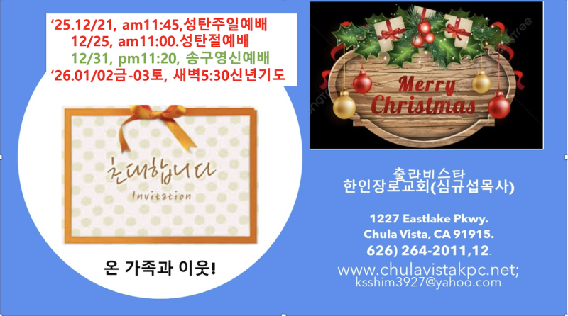 온 세상의 구주와 주와 하나님의 아들로 오신 예수 그리스도의 탄생을 함께 기뻐하며 축하할 귀한 자리에 한인 교우 여러분을 초청합니다. 교회를 쉬고 계시거나 낙심되고 근심된 일이나 고난 중에 계신 분들을 환영합니다.