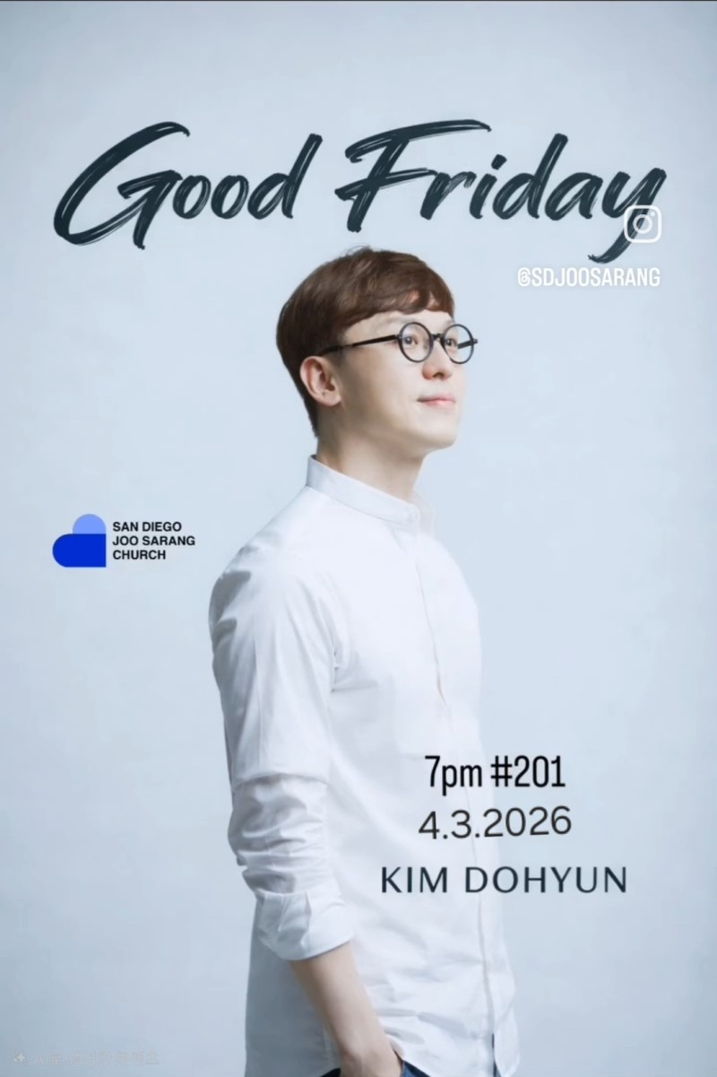 이번 성금요예배는 4월 3일(금) 오후 7시, 샌디에이고 주사랑교회 드림센터 201호에서 열린다. 교회는 이번 예배를 통해 성도들이 찬양과 말씀, 그리고 성찬 가운데 십자가의 은혜를 더욱 깊이 바라보며, 예수 그리스도의 사랑과 구원의 복음을 마음에 새기는 시간을 갖게 되기를 기대하고 있다.