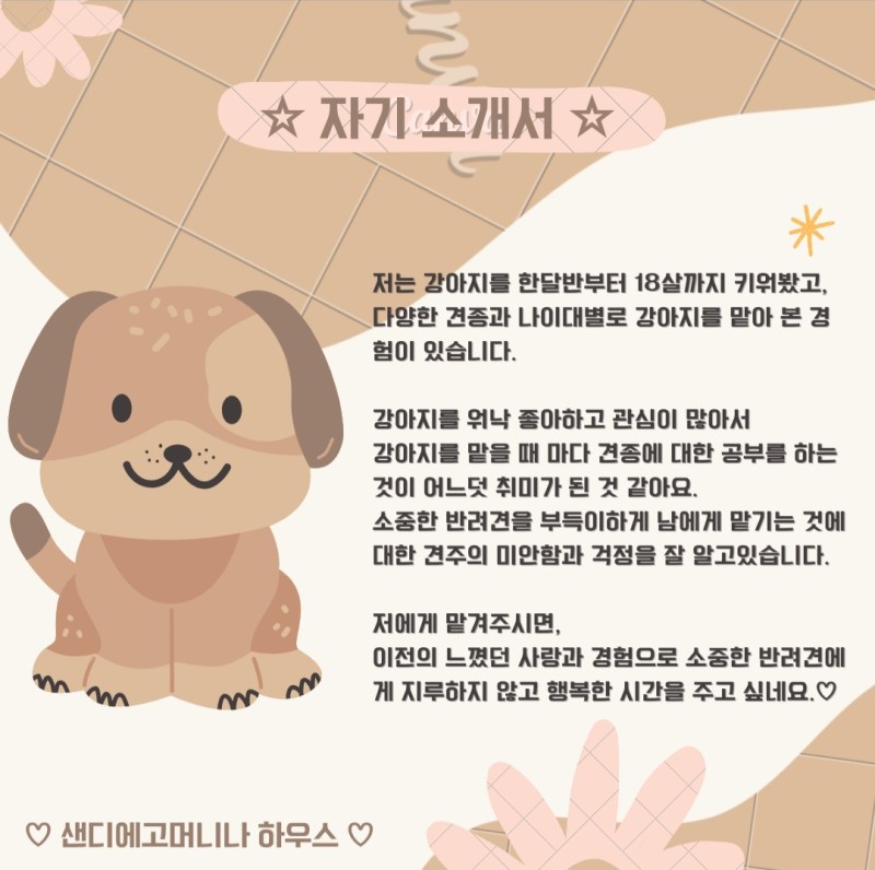 소중한 강아지 사랑과 정성으로 돌봐드리는 샌디에고머니나 하우스입니다.