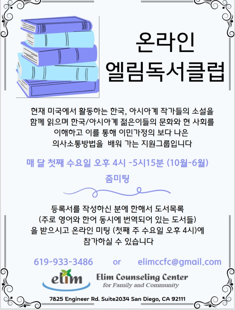 문의 619 933 3386 혹은 웹사이트 https://www.elimccfc.org/