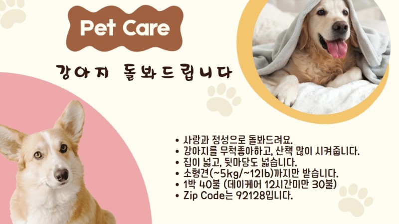 강아지 사랑으로 돌봐드려요 포근하늘 구인/구직 0 291 01.22 09:34 사랑과 정성으로 돌봐드려요.강아지를 무척좋아하고, 산책 많이 시켜줍니다.집이 넓고, 뒷마당도 넓습니다.소형견(~5kg/~12lb)까지만 받습니다.1박 40불 (데이케어 12시간미만 30불)Zip Code는 92128입니다.관심, 궁금하게 있으시면 쪽지주세요. 0 Comments 로그인한 회원만 댓글 등록이 가능합니다. 목록 검색조건 제목 내용 제목+내용 검색어 또는 그리고 검색 번호 제목 날짜 조회 5885 [기타] 호두과자 택배로 받아보세요 11 03.31 03.31 11 5884 [여행] LA여행 사랑방(인기 크루즈여행) 2026년 3월 특별 프로모션 63 03.29 03.29 63 5883 [구인/구직] PGA pro의 온라인 골프 레슨 ($40 부터) 77 03.27 03.27 77 5882 [기타] 라이드 구해요! 47 03.23 03.23 47 5881 [여행] 4/8~12 샌디에고 가족투어 희망 요청 112 03.15 03.15 112 5880 [골프] 20/30 골프 166 03.02 03.02 166 5879 [음악] 합창단원 166 03.01 03.01 166 5878 [알림] 골프 배우실 분 보세요 285 02.17 02.17 285 5877 [알림] 테니스 배우실 분 보세요. 232 02.17 02.17 232 5876 [테니스] STROKE & SHOT SD 테니스 골프 커뮤니티 신규 회원 … 269 02.15 02.15 269 5875 [골프] STROKE & SHOT SD 테니스 골프 커뮤니티 신규 회원 … 164 02.15 02.15 164 5874 [골프] ★ 샌디에고 골프클럽 ‘온더그린’ 오픈채팅방 오픈! ★ 236 02.12 02.12 236 5873 [세일/쇼핑] [올영 1위 디바이스 크라이오 소닉] 미국 출시 기념 "전원" … 169 02.12 02.12 169 5872 [일반] 방과후 럭셔리체육 277 02.08 02.08 277 5871 [음악] 합창단원 모집 279 02.06 02.06 279 5870 [세일/쇼핑] [재택/미국] 한국 제품 아마존 시장조사 및 실사용자 피드백 모… 253 02.05 02.05 253 5869 [기타] [온라인] 2월 독서모임 ‘나란’ 신규 참여자 환영 202 01.30 01.30 202 5868 [기타] 사주 명리학 지도 및 상담 187 01.29 01.29 187 5867 [알림] 사주 명리 상담 및 개인 지도 183 01.28 01.28 183 5866 2 [기타] 피클볼 무료 레슨해 드립니다. 2 371 01.23 01.23 371 열람중 [구인/구직] 강아지 사랑으로 돌봐드려요 292 01.22 01.22 292 5864 3 [구인/구직] 동양화/서예 클래스 회원모집 3 487 01.21 01.21 487 5863 [기타] 업데이트 2: 소셜 클럽, "와인과 친구들" 358 01.13 01.13 358 5862 [테니스] SALT 회원 모집합니다. 417 01.11 01.11 417 5861 [알림] Healing Chapter 여성 북클럽 326 01.08 01.08 326 5860 [기타] [온라인] 1월 독서모임 ‘나란’ 신규 참여자 환영 314 01.04 01.04 314 5859 [기타] <세스나 비행기, 비행교육 합니다> 324 2025.12.22 2025.12.22 324 5858 [음악] '25 조지아텍 합격 | AI·STEM MIDI 음악 작곡&편곡… 417 2025.12.07 2025.12.07 417 5857 [기타] <비행 교관 수업 무료 참관 안내> 327 2025.12.03 2025.12.03 327 5856 [알림] 테니스 레슨에 관심 있으신 분들 보세요. 542 2025.11.23 2025.11.23 542 5855 [기타] 무료로 탁구치기 원하시는 분 모집합니다. 768 2025.11.07 2025.11.07 768 5854 [등산/하이킹] 월목 하이킹클럽 903 2025.10.25 2025.10.25 903 5853 [일반] 사주 실시간 라이브방송 합니다. 545 2025.10.14 2025.10.14 545 5852 [축구] 어릴 적 오락실 감성, 다시 살아나다! 658 2025.10.14 2025.10.14 658 5851 [음악] 줄리어드 전액장학생 졸업, 바이올린 비올라 렛슨합니다. 710 2025.10.10 2025.10.10 710 5850 [미술] ***미주전지역 온라인 디지털 아트 클래스 프로크리에이트 Zoo… 660 2025.09.23 2025.09.23 660 5849 [건강/다이어트] 정신건강/대화소통기술과 공감기술 위한 엘림상담센터 온라인 독서클… 679 2025.09.11 2025.09.11 679 5848 [기타] [외교부] 총 상금 1,200만원 공공외교 우수사례 공모전(수기… 614 2025.09.11 2025.09.11 614 5847 1 [테니스] 피클볼 무료로 레슨을 원하시는 분들 연락주세요.. 1 878 2025.09.07 2025.09.07 878 5846 [기타] [추천공모전] 2025년 제3회 국민 공공외교 우수사례 공모전 … 630 2025.09.03 2025.09.03 630 5845 [골프] 주니어 골프 선수 전문 지도 (샌디에고 & 테메큘라) 860 2025.08.29 2025.08.29 860 5844 [기타] 중, 고등학생을 위한 배구 모임 - Volley Ball Ope… 515 2025.08.26 2025.08.26 515 5843 [음악] 기타, 하프, 하모니카 무료 클래스 시작합니다. 735 2025.08.20 2025.08.20 735 5842 [건강/다이어트] 발레(Ballet), 바레(Barre) 수업합니다. 696 2025.08.13 2025.08.13 696 5841 [일반] 자가용 비행기 라이센스 수업합니다(콘보이) 537 2025.08.02 2025.08.02 537 5840 [미술] 취미미술 성인반 모집 941 2025.07.30 2025.07.30 941 5839 [테니스] 렌초 버나도 에서 아침7시에 테니스 치실분 896 2025.07.26 2025.07.26 896 5838 [기타] 북클럽 나란 2025년 8월 모임 809 2025.07.24 2025.07.24 809 5837 [알림] 골프 배우실 분 보세요 772 2025.07.22 2025.07.22 772 5836 [알림] 테니스 재능기부 레슨 있음을 알려드립니다. 609 2025.07.22 2025.07.22 609 5835 [PET사랑] [RolloRalla America] 이미 2만명이 넘는 고객과… 643 2025.07.22 2025.07.22 643 5834 [PET사랑] 펫시터 구합니다! 814 2025.07.10 2025.07.10 814 5833 (딘킴프로) 여름방학 주니어 레슨 합니다. (초보나 선수 모두 … 709 2025.06.23 2025.06.23 709 5832 [일반] ♤자가용 비행 라이센스 교육합니다♤ 592 2025.06.26 2025.06.26 592 5831 [골프] (딘킴프로) 여름방학, 샌디에고 골프 레슨,, 못고치는 스윙은 … 813 2025.06.23 2025.06.23 813 5830 [일반] 사주 상담 하는 분 소개 드립니다 538 2025.06.23 2025.06.23 538 5829 [알림] Carmel Valley - 태권도장 오픈 768 2025.06.19 2025.06.19 768 5828 [알림] 골프 배우실 분? 755 2025.06.02 2025.06.02 755 5827 [알림] 태니스 재능기부 레슨있음을 알려드