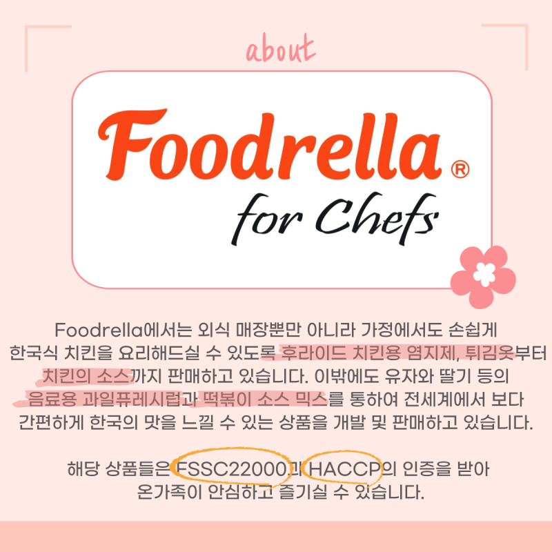 한국의 유명 치킨 브랜드들의 소스와 시즈닝을 담당하고 있는 업소용 소스, 시즈닝 한국 제조전문업체 Hanmi F3라고 합니다.