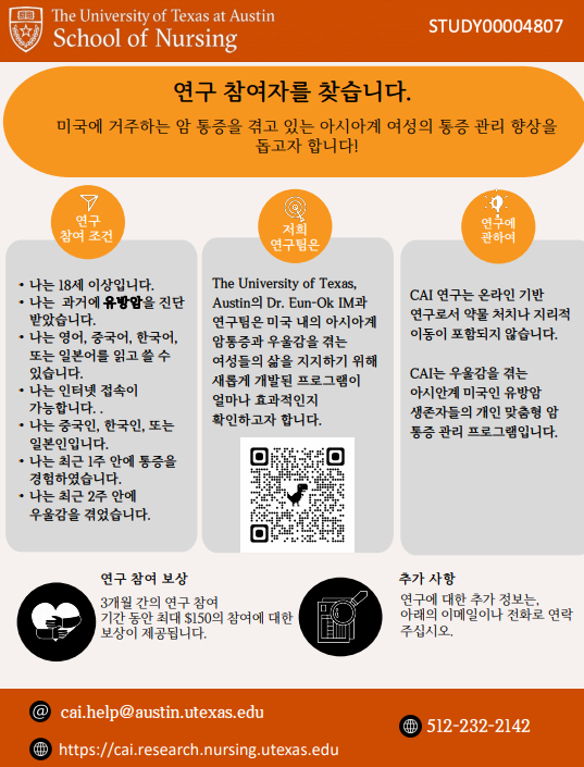 University of Texas at Austin 대학교 Dr. Eun Ok Im PhD, MPH, RN, CNS, FANN 연구팀은 미국 국립보건연구원(NIH)에서 지원을 받아 미국에 거주하고 계시는 한인 여성들을 위한 3가지 연구를 진행 중에 있고, 연구 참여자를 모집하고 있습니다.