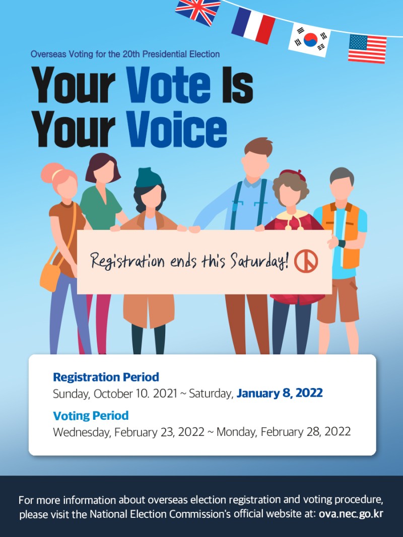 For more information about overseas election registration and voting procedure, please visit the National Election Commission's official website at: ova.nec.go.kr