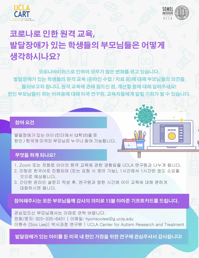 전단지를 보시고, 동참하시고 싶은 부모님들은 이메일, 전화 또는 문자로 연락 바랍니다. 참여해주시는 모든 분께 작은 감사의 의미로 $15 아마존 기프트카드 드립니다. 감사합니다.