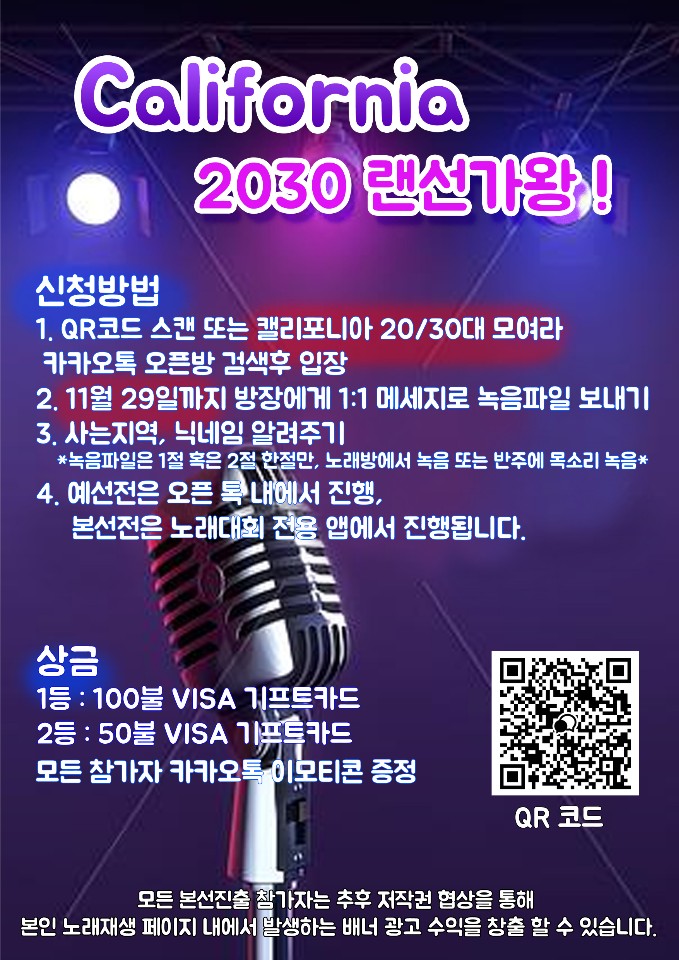 캘리포니아 지역 2030대 랜선 노래대회 합니다.