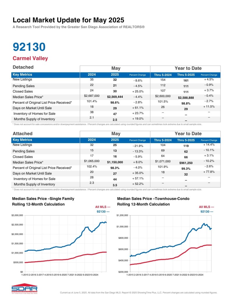 카멜 밸리 (Zip Code: 92130) 2025년 5월달 마켓 업데이트 입니다.