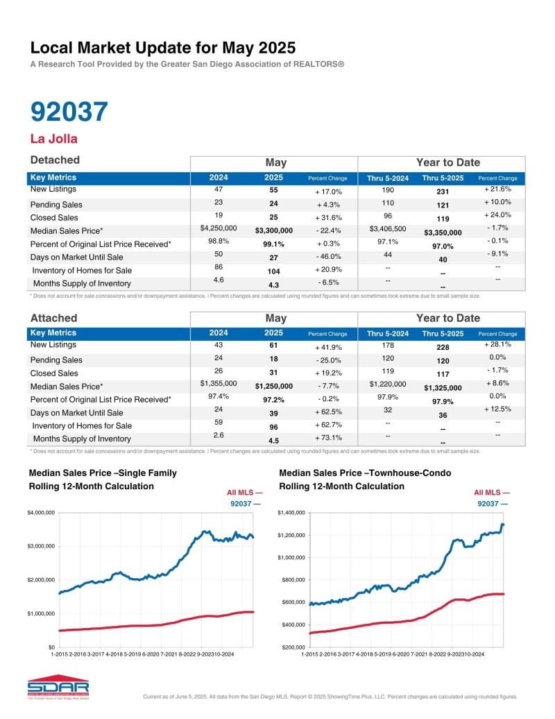 라호야지역 (Zip Code: 92037 & 92122- UTC지역 포함) 2025년 5월달 마켓 업데이트 입니다.