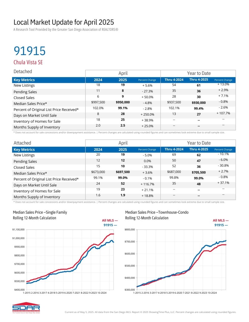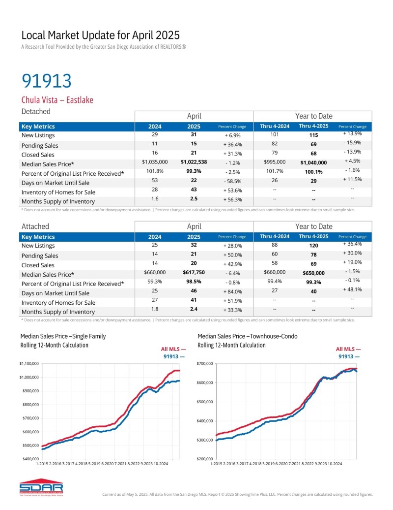 출라 비스타 동쪽지역 (Zip Code: 91913, 91915) 2025년 4월달 마켓 업데이트 입니다. 새 매물이 1년 전에 비해 증가했습니다.