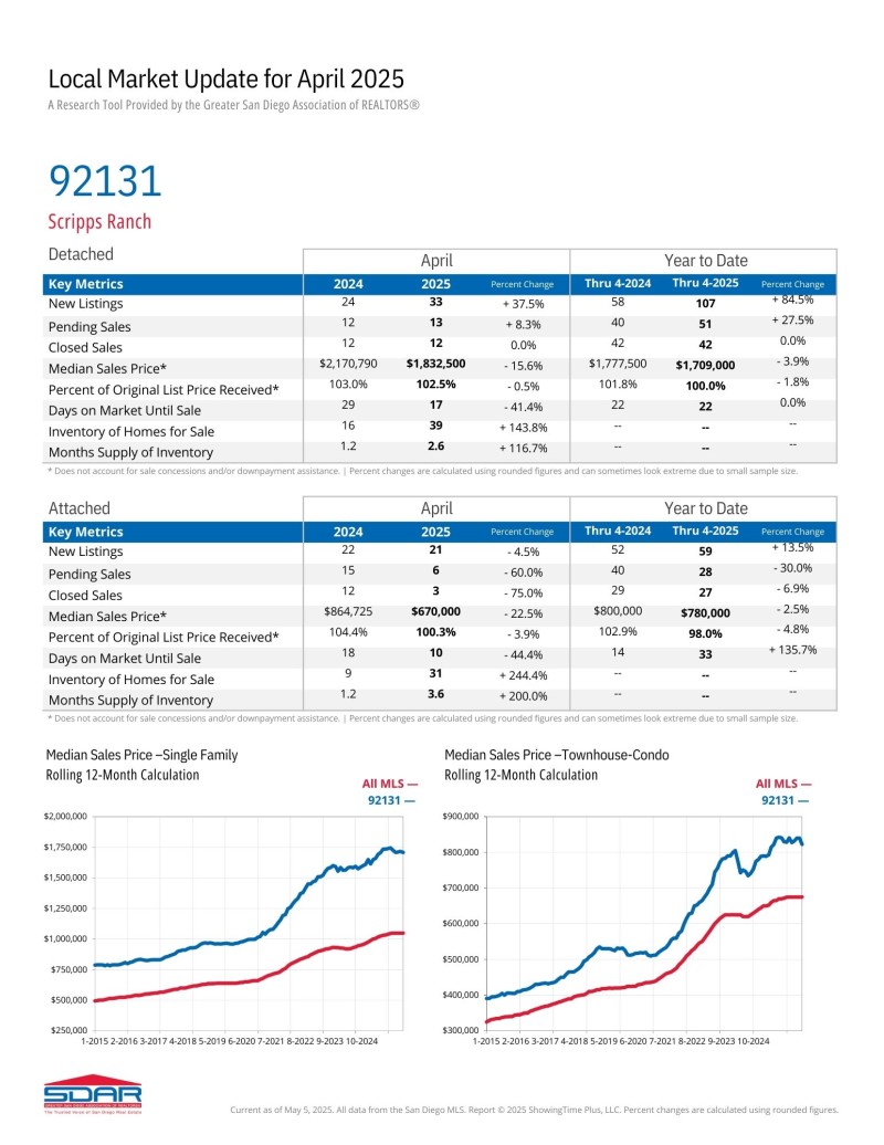 스크립스 랜치 (Zip Code: 92131) 2025년 4월달 마켓 업데이트 입니다. 1년 전과 비교했을 때 가격이 하락했습니다.