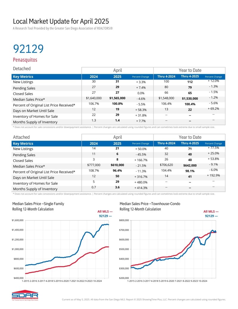 랜쵸 페나스퀴토스 (Zip Code: 92129) 2025년 4월달 마켓 업데이트 입니다. 1년 전에 비해 매물은 증가하고 가격은 하락했습니다.