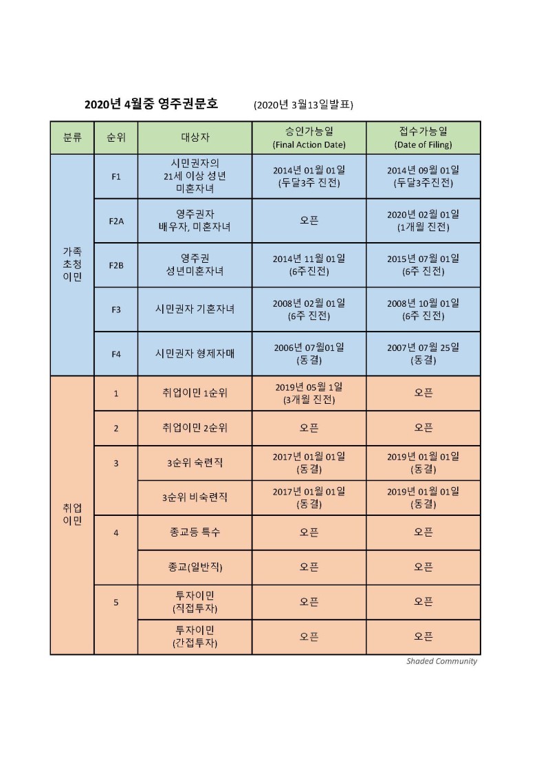 2020년 4월 1일부터 적용되는 4월의 영주권 문호 에서는 취업이민 1순위 승인가능일(Final Action Date)이 3개월 진전되고 3순위는 제자리 걸음 했습니다.