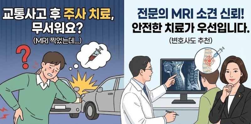 1. 변호사가 아닌, 전문의와 MRI의 판단입니다. 이 주사는 변호사가 합의금 높이려고 맞으라고 하는 게 절대 아닙니다. MRI상 디스크가 신경을 누르고 있거나 심각한 염증이 보이기 때문에, 해당 분야 최고 전문가인 전문의(M.D.)가 "이건 물리치료 단계를 넘어섰다"고 의학적으로 판단한 것입니다. 의사가 권할 때는 그만큼 치료의 이득(Benefit)이 위험(Risk)보다 훨씬 크기 때문입니다.