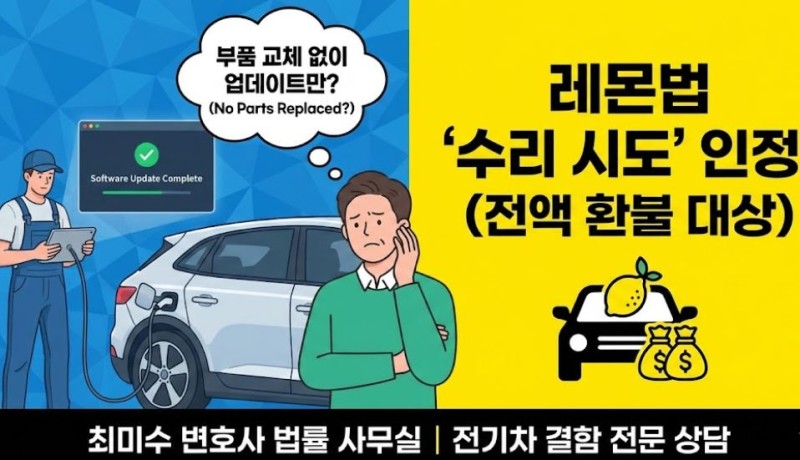 Q: 변호사님, 작년에 뽑은 2024년식 전기차(EV)를 타고 있습니다. 주행 중에 갑자기 화면이 새카맣게 꺼지거나, 차가 덜컹거리는 증상이 있어서 딜러십에 갔습니다. 그런데 어드바이저가 기계를 열어보지도 않고, 기계적 결함은 없고 소프트웨어 오류라서 리셋하고 업데이트만 해드렸습니다. 이제 정상입니다.라고 하더라고요. 문제는 이 증상 때문에 벌써 3번째 똑같이 업데이트만 받고 왔다는 겁니다. 부품을 뜯어서 고친 게 아니니까 이런 건 레몬법 대상이 안 되겠죠? 그냥 타야 하나요?