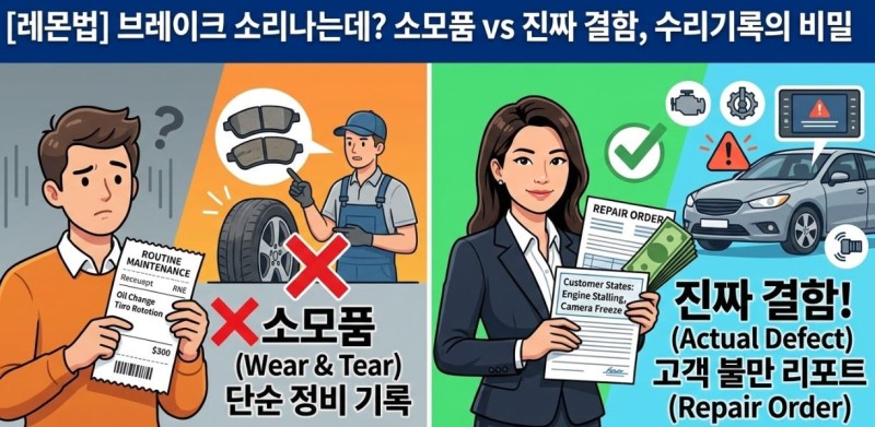 안녕하세요, 레몬법 전문 최미수 변호사 법률 사무실입니다. 차에서 자꾸 브레이크 소리가 나고 타이어 바람이 빠집니다. 딜러십에 3번이나 갔는데 이거 레몬법으로 환불 되나요? 상담시 종종 듣는 질문입니다. 안타깝지만, 정답은 아니요일 확률이 높습니다. 많은 소비자분들이 차량의 자연스러운 소모(Wear & Tear)와 레몬법 대상이 되는 결함(Defect)을 헷갈리시곤 합니다. 오늘은 내 차의 문제가 레몬법 소송이 가능한 진짜 결함인지 구분하는 법과, 보상금을 챙기기 위해 반드시 만들어야 하는 수리 기록의 비밀을 알려드립니다.